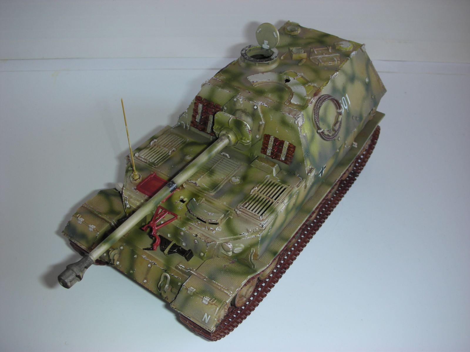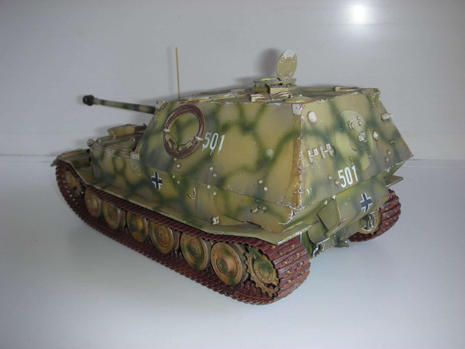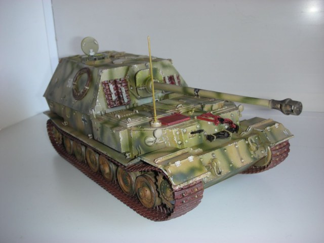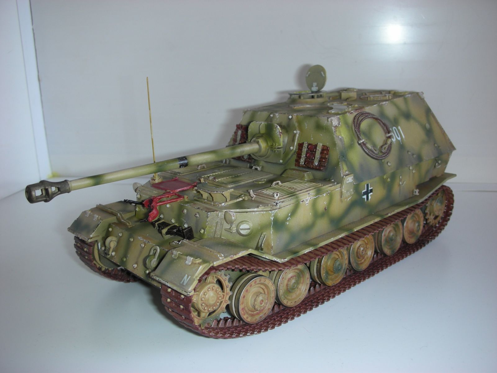 Если собирать это модель из коробки как вы выразились без "шизофрении" то получится что то не понятное, похожее не то на фердинанд не то на элифант (мутант)так что мат часть не оцениваю! Окрас и тонировка удались!