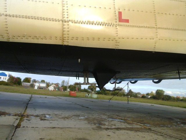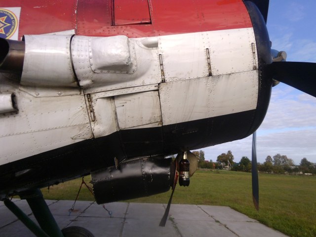 Бутылка подвешена к выхлопному коллектору, т.к. двигатель звезда,т.е.цилиндры по кругу,то масло стекает в нижние цилиндры во время стоянки и через поршневые кольца и открытые клапана стекает в коллектор и если не подвесить бутылку то через хомуты стягивающие секции вытекут на стоянку под самолет а во время запуска плюхнут на борт! Также перед запуском вращают двигатель за воздушный винт чтобы выгнать масло из нижних цилиндров, дабы не было гидроудара и это масло опять же стекает в эту бутылку. Перед вылетом на место бутылки заворачивают спец. пробку! Вот такие дела!