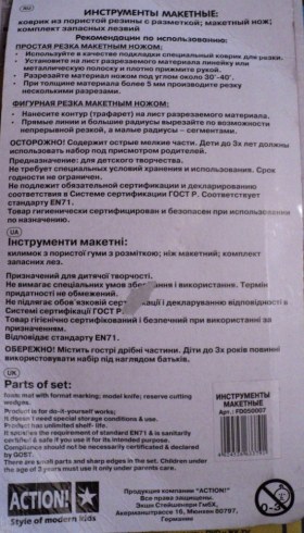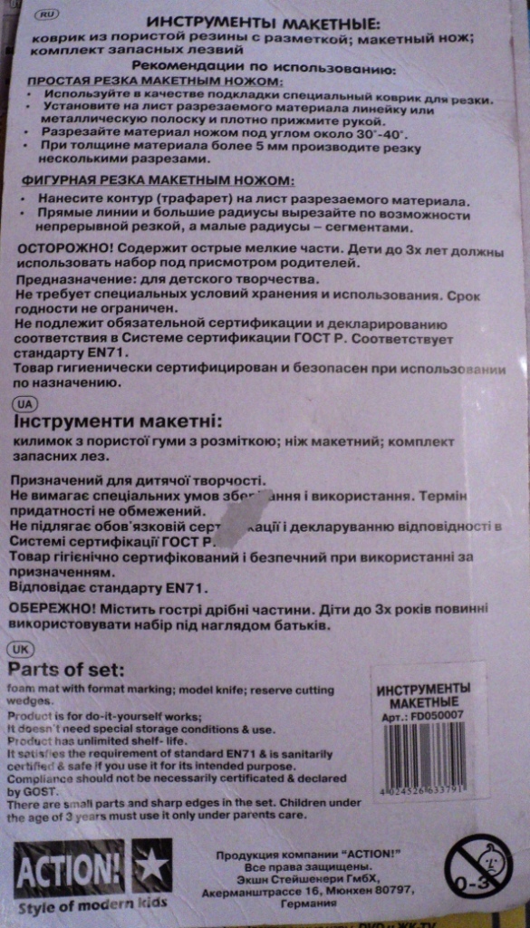 В магазине "Океан Идей" среди товаров по рукоделию лежали модельные коврики. Я решил приобрести вот такой мини-коврик и резак с запасными лезвиями. Буду брать его в отпуск: в дождливые дни в карельской деревне часто хочется очень долго и упорно пилить и шпаклевать что-нибудь дровишестое.