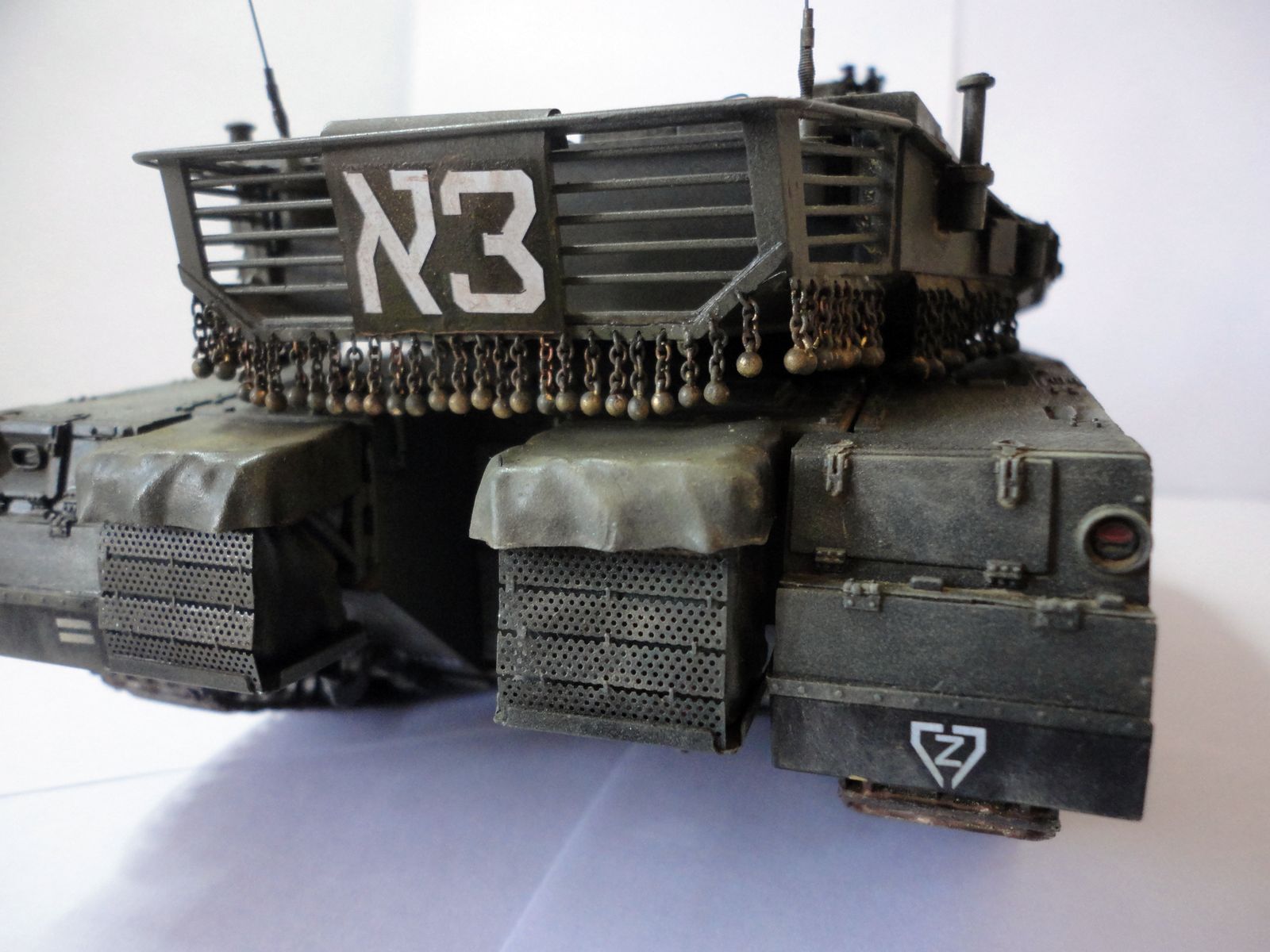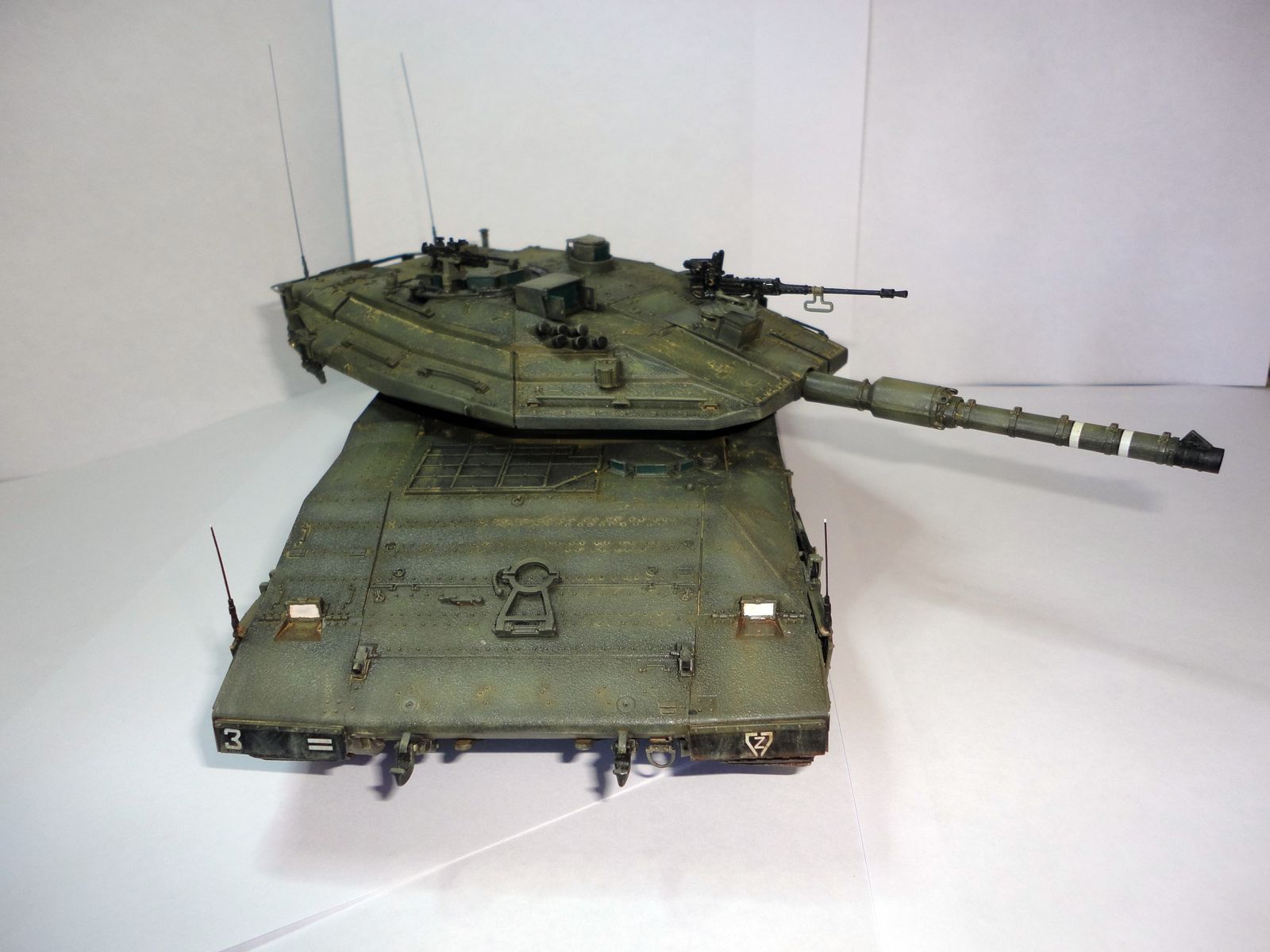 Непонятна тактическая разметка: этот танк он 3 или 3 Алеф? Потому что на переднем правом брызговике у него написано 3, а на заднем левом 3 Алеф и на башенном щите 3 Алеф. И шеврон на второй плате направлен вершиной вниз, что означает первую роту в батальоне, а горизонтальных полос на брызговиках две, что означает вторую роту.