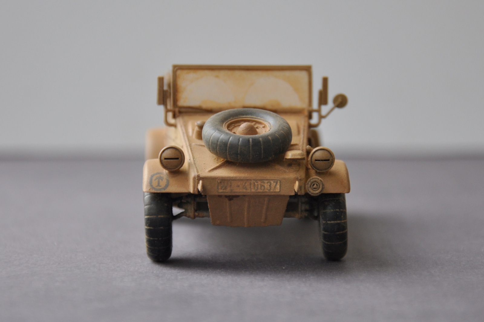 Здравствуйте, уважаемые коллеги. Перед вами модель автомобиля "Кубельваген" от Тамии. Собиралось всё из коробки и без всяких проблем. Привязки к прототипу не делал. Грунтовал и красил тамиевскими грунтами и красками, пылил пигментами от МИГа и МПС. Особо "ушатывать" модель не собирался, поэтому со следами эксплуатации не усердствовал)