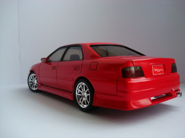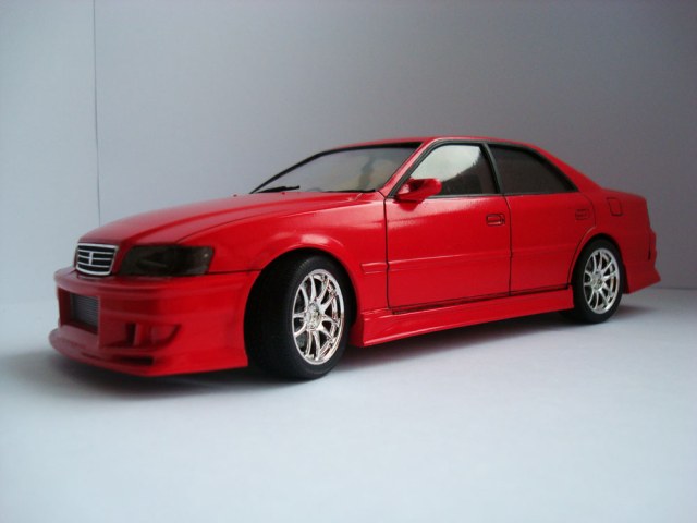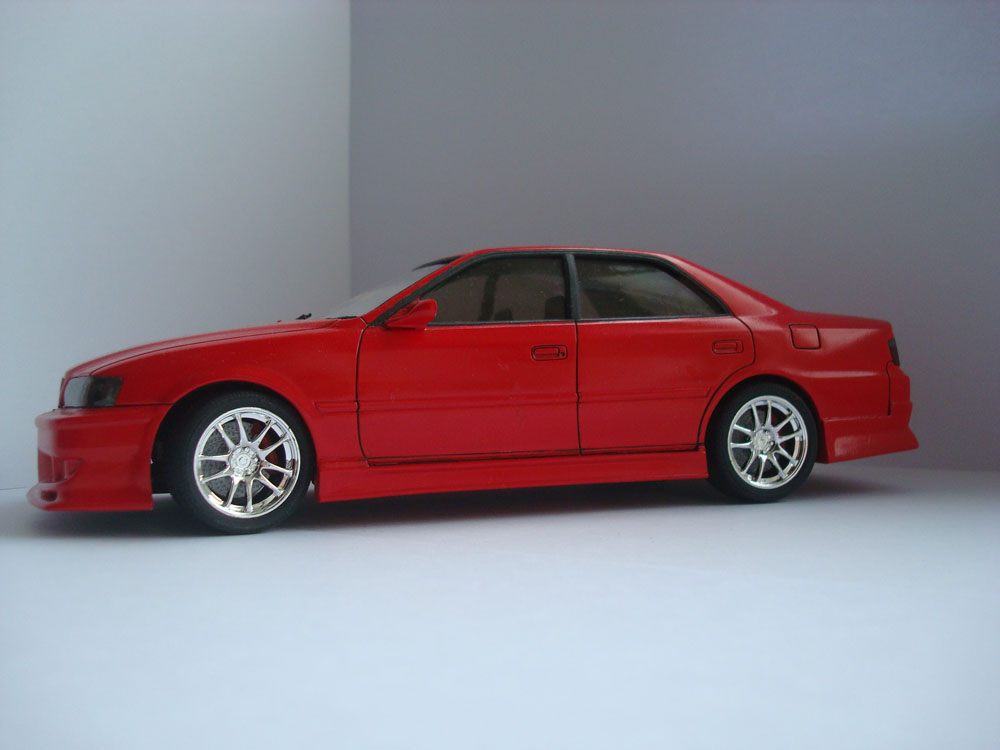 Toyota Chaser в тюнинге Kunny'z. Долго искал чайзер, вообще то хотел в тюнинге от блитц, но нашел только этот. Крыша была треснута по диагонали, стойки стекол погнуты. Но это не остановило))))) Редкая модель чемпионата D1. Уже придя домой понял, что производитель схалтурил. В обычный комплект стокового чайзера закинули литники с зеркалами, передним бампером, накладками на пороги и задний бампер, спойлером и литьем. Даже салон околостоковый, разве что спортивные ковши кинули в коробку. Поэтому лист с декалями было решено отложить и делать просто красивый чайник))) Понял одно, выбор у аошимы может и хорош, но вот качество (я не о пластике, он отменный, да и утяжин и стыков не было). Накладки пришлось подгонять, долго и упорно. Стекло кривое, а феном побоялся выравнивать. К тому же соединял кузов с днищем около часа, там такая система дурацкая. Уже когда соединил, понял, что клиренс как у стокового)))))) В общем соответствие оригиналу невысокое. Из дороботок тонировка (автомобильная тонировка для фар, "хулиганка"), бархат в салон, но его не видно из-за тонировки, хотя продавец уверял, что эта пленка пропускает 95% света))) Вся краска тамия, кузов тс-8, кроме уплотнителей, их ревеллом делал. Полировка тамия. Жду отзывов.