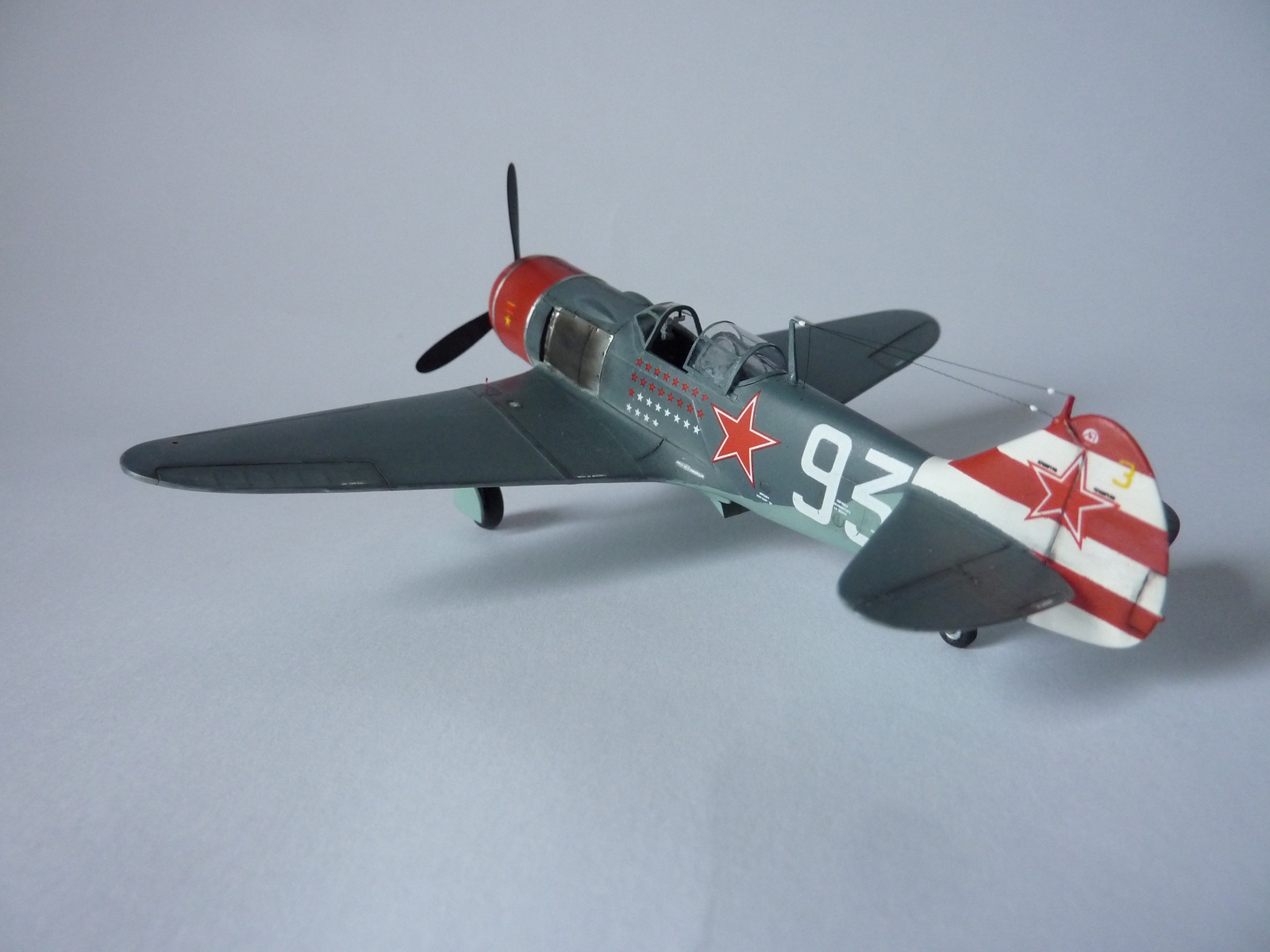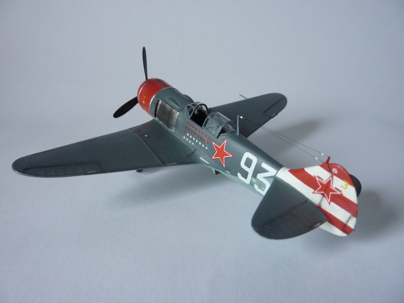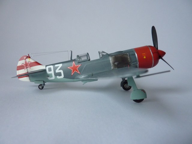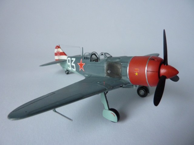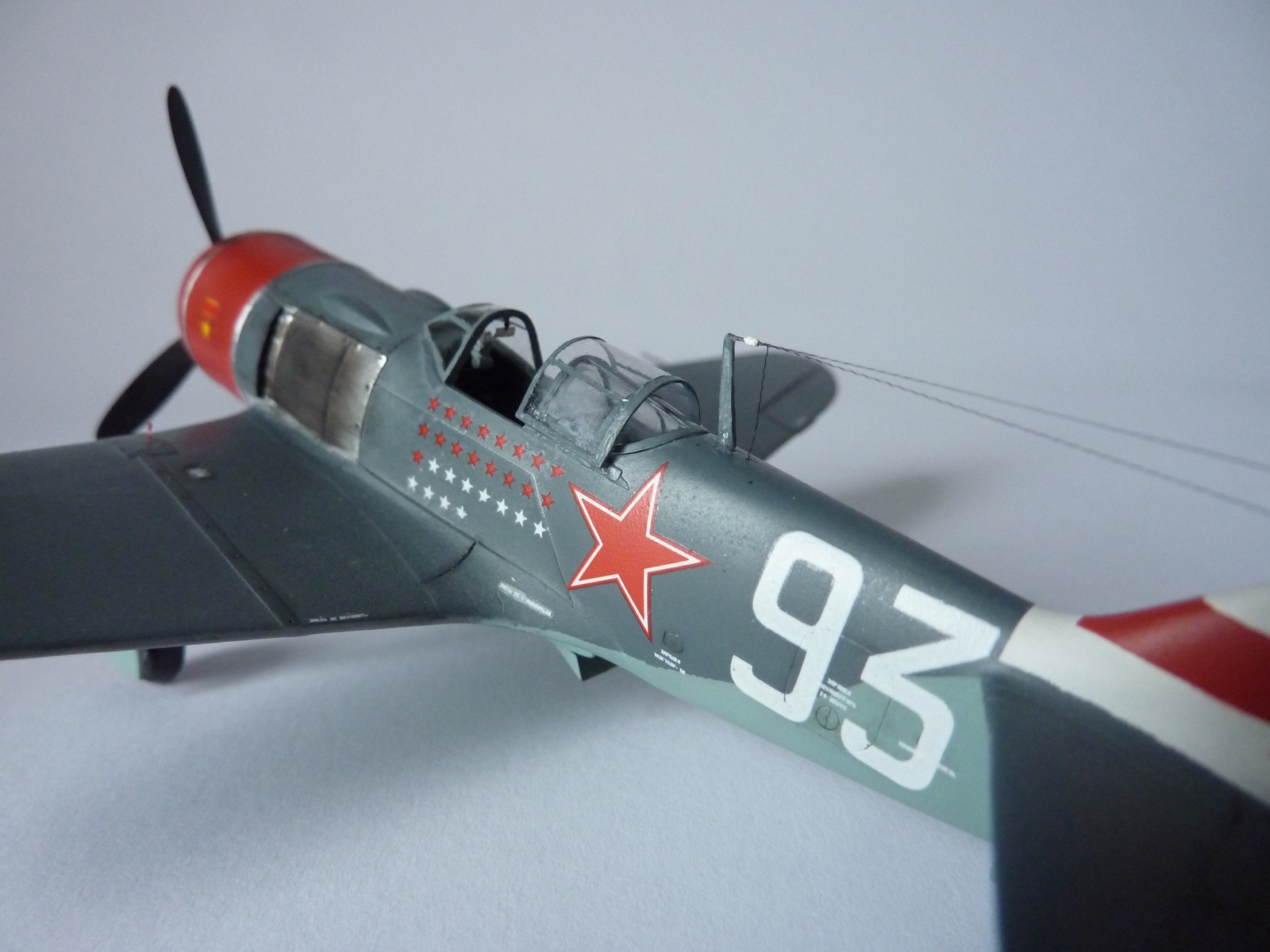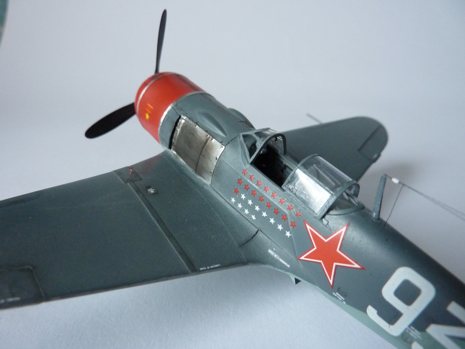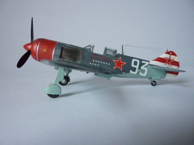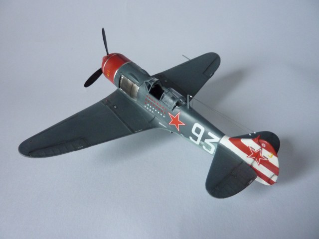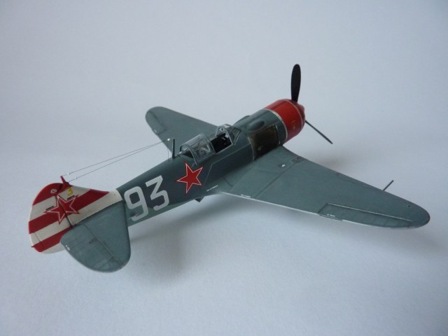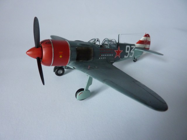 Здравствуйте коллеги! На этот раз хочу представить вам, модель истребителя Ла-7( двух пушечная версия), чешской фирмы Eduard. Набор порадовал, хорошая деталировка модели, и не менее хороший выбор окраски. Шпаклёвки не понадобилось. Пришлось немного исправить ошибку производителя, как известно многим моделистам, кок винта у модели напоминает форму шлема Ильи Муромца. Немного углубил маслорадиатор. Жаропрочные накладки и стяжные ленты из клеящейся фольги. Решил оставить открытую кабину, а фонарь у производителя хоть и прозрачный, но толстенный. Так как я не умею делать вакушные фонари, сделал только сдвижную часть фонаря сделать из плёнки, из-за суперклея па стёклах появилась дымка. Плёнку взял из упаковки зубных щёток. Натянута антенна из бантика. Поставил солдатики из ворса от зубной щётки. Окраску выбрал командира Долгушина, про него можно прочитать здесь: http://www.airwar.ru/history/aces/ace2ww/pilots/dolgushin.html. Красил аэрографом, краски эмалевые Revell, Humbrol, лак TAMIYA. Расшивку и нагар, выделял пастелью. Ну а так вроде всё.
