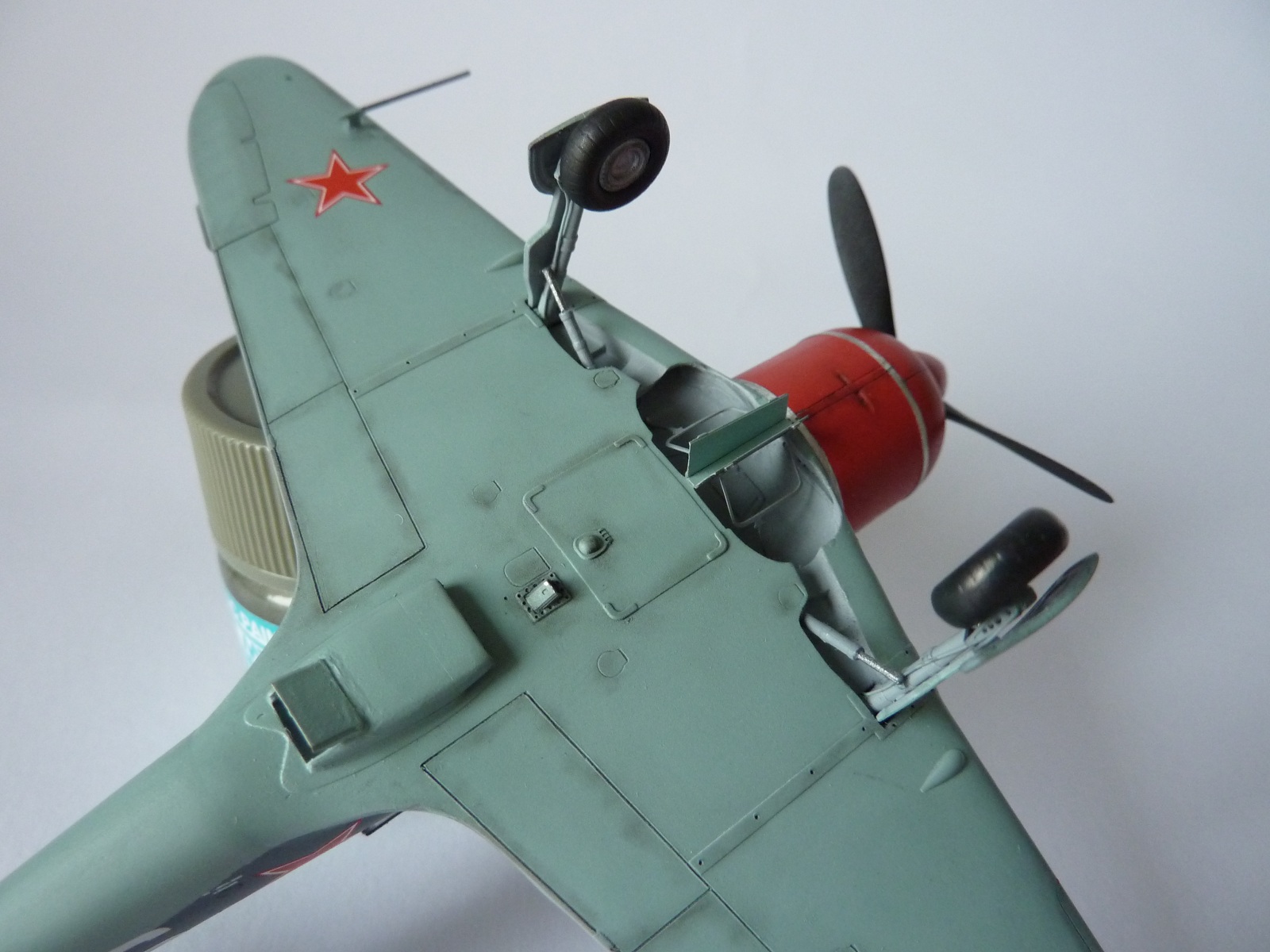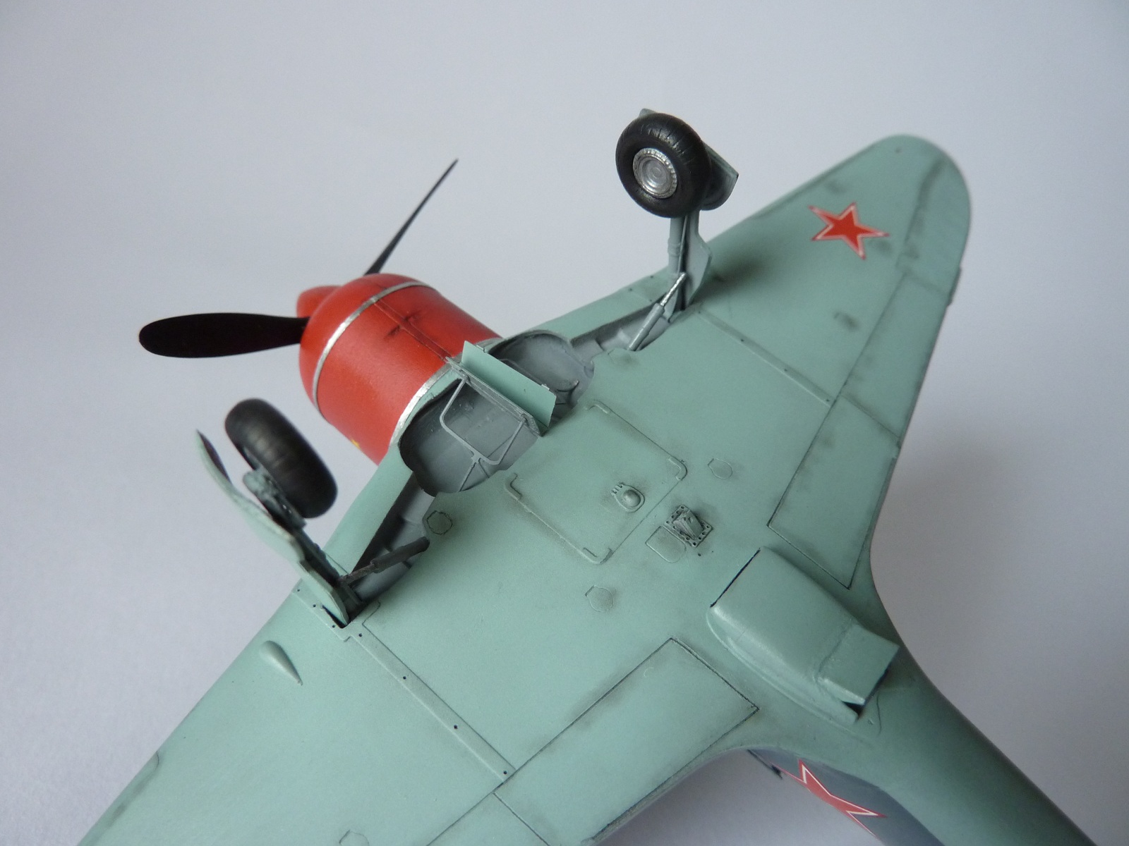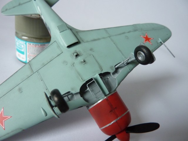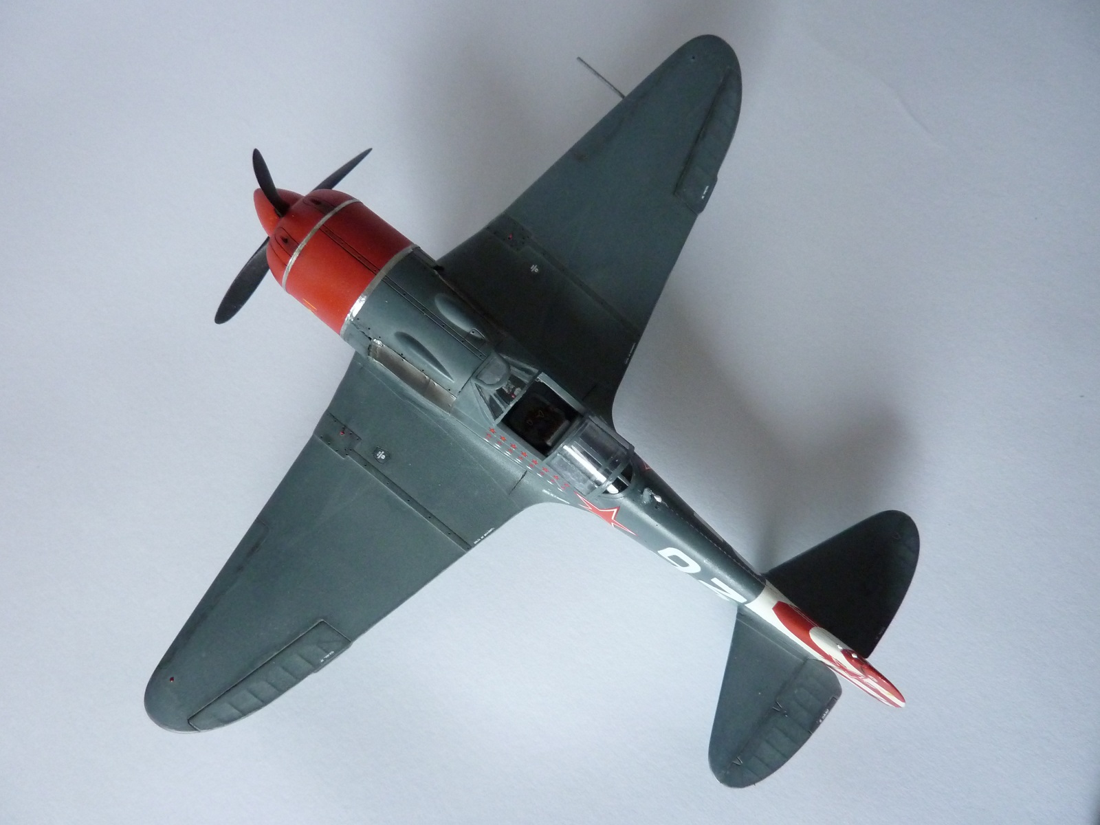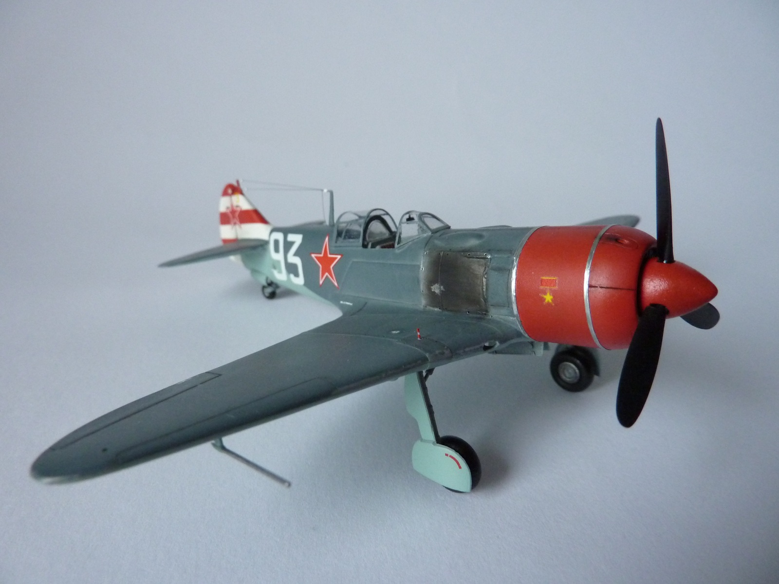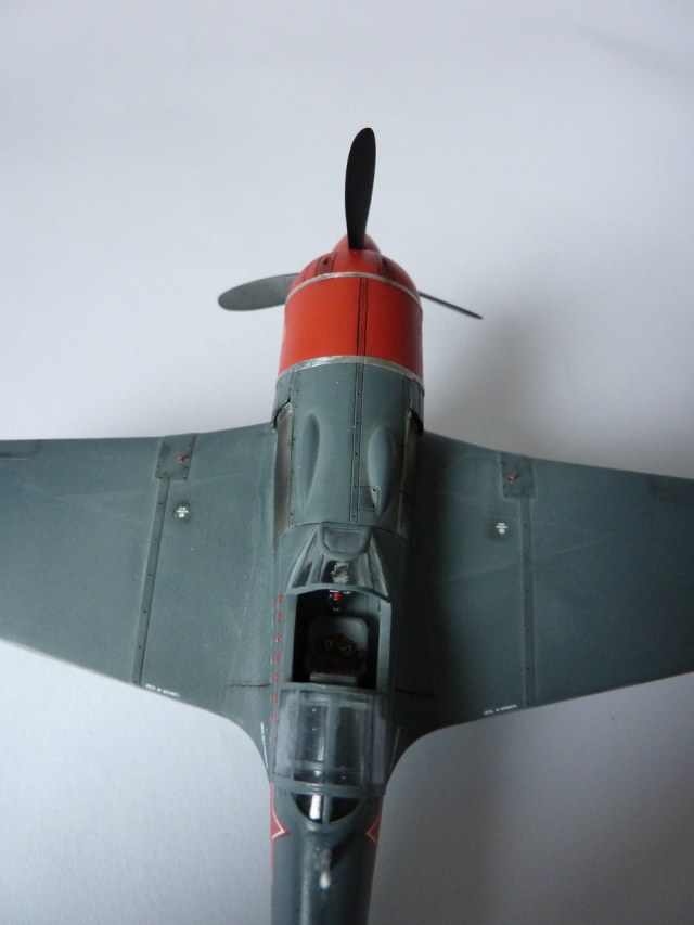 Здравствуйте коллеги! На этот раз хочу представить вам, модель истребителя Ла-7( двух пушечная версия), чешской фирмы Eduard. Набор порадовал, хорошая деталировка модели, и не менее хороший выбор окраски. Шпаклёвки не понадобилось. Пришлось немного исправить ошибку производителя, как известно многим моделистам, кок винта у модели напоминает форму шлема Ильи Муромца. Немного углубил маслорадиатор. Жаропрочные накладки и стяжные ленты из клеящейся фольги. Решил оставить открытую кабину, а фонарь у производителя хоть и прозрачный, но толстенный. Так как я не умею делать вакушные фонари, сделал только сдвижную часть фонаря сделать из плёнки, из-за суперклея па стёклах появилась дымка. Плёнку взял из упаковки зубных щёток. Натянута антенна из бантика. Поставил солдатики из ворса от зубной щётки. Окраску выбрал командира Долгушина, про него можно прочитать здесь: http://www.airwar.ru/history/aces/ace2ww/pilots/dolgushin.html. Красил аэрографом, краски эмалевые Revell, Humbrol, лак TAMIYA. Расшивку и нагар, выделял пастелью. Ну а так вроде всё.