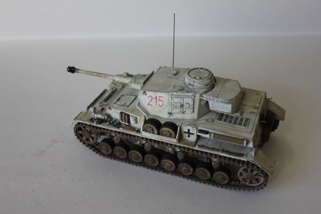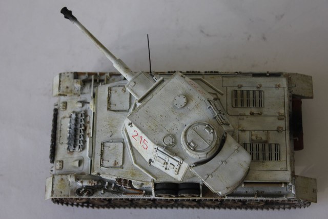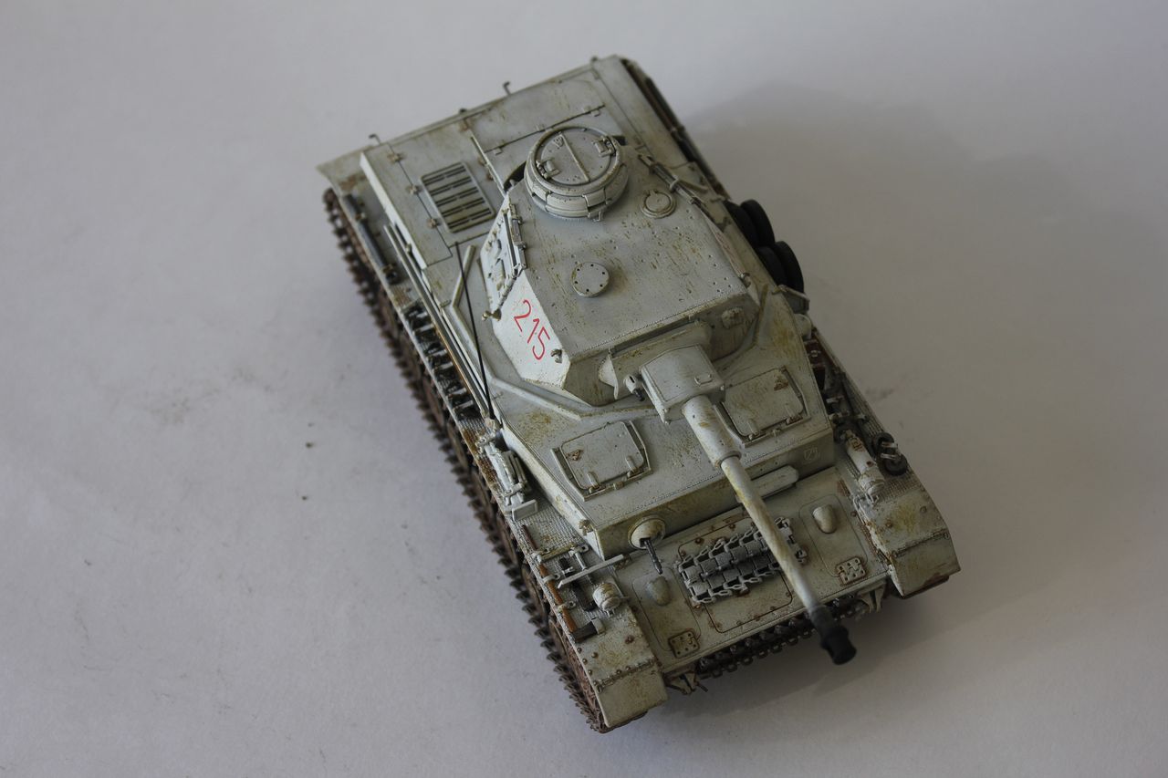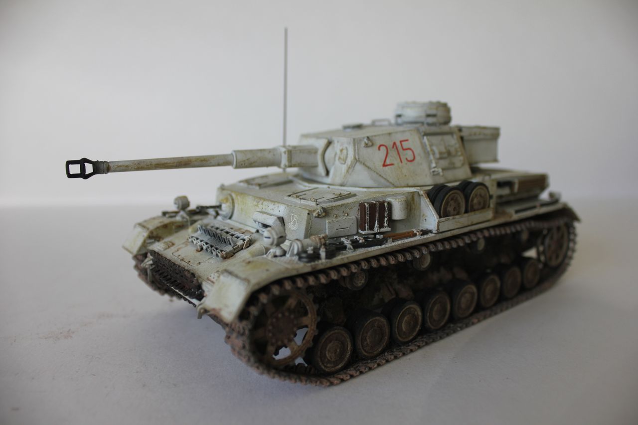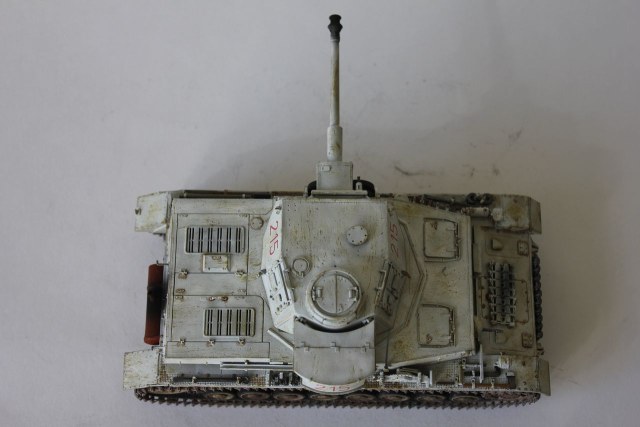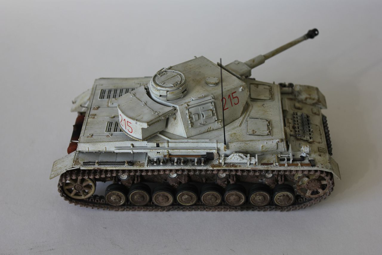 Очень красиво и довольно реалистично окрашено. Можно еще следы от экипажа на броне сделать чуть темнее, т.к. на ходовой видна темная грязь, по которой двигалась машина, и кое-где на углах корпуса и башни, около люков, на МТО чуток подснять белый камо, т.к. окраска в белый была не особо стойкая (хотя, если машину только недавно перекрасили...). Ваша окраска больше похожа на окраску в зимний камо в заводских условиях, что, по-моему, немцы не практиковали, а окрашивали машины в войсках... А вот модель нашей техники, которая красилась иногда в белый на заводах, выглядела бы отлично... Хотя это все рассуждения, а модель, безусловно, понравилась...