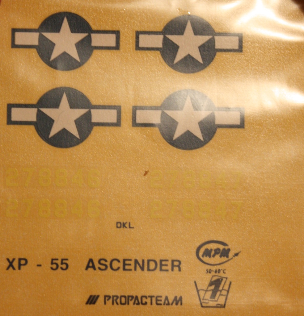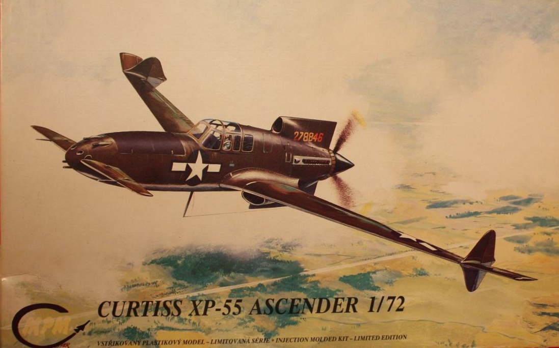 Данный кит доводилось видеть живьем и теперь жалею, что не купил его. Занятная каракатица. И дополнение к истории аппарата. XP-55 появился в такое время, когда поршневые двигатели подошли к своему пределу, а реактивные были крайне сырыми и еще никто не знал, сколько времени уйдет на их доводку. Вот и возникла идея (причем не только в Штатах) поднять характеристики за счет необычной компоновки. Проектировался XP-55 под перспективный двигатель PW Х-1800 (2200 л.с.), но он не получился, почему и пришлось поставить гораздо менее мощный V-170-95. После появления реактивных истребителей интерес к XP-55 закономерно угас. 3-й прототип разбился 3.05.1945 на воздушном параде, 2-й находится сейчас в Национальном аэрокосмическом музее.