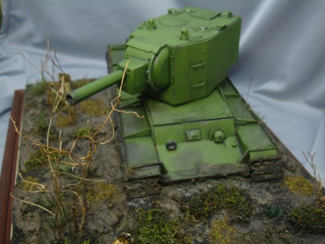 Добрый вечер. Вот выставляю наваш суд модель танка КВ2 от ВЭ. Про качество отливок говорить небуду его все знают(при желании получаються весьма достойные модели, но не в этом случае). Бедняге досталось по полной до того как он попал на основание этой диорамки так как его огромная башня служила отличным местом для заначки(копилка так сказать), что неизбежно привело к тому что пару раз он падал, переклеевался, но в итоге мне его стало жалки и слепив его назад в кучу(вернее все то что от него осталось) я его загнал в болото. Модель собиралась изкоробки, без привязки к какому-нибудь прототипу. Гусли наборные от тогоже ВЭ. Из неродного только фара и антена. Основание Гипс+черный акрил+ ПВА+натуральный мох+земля.