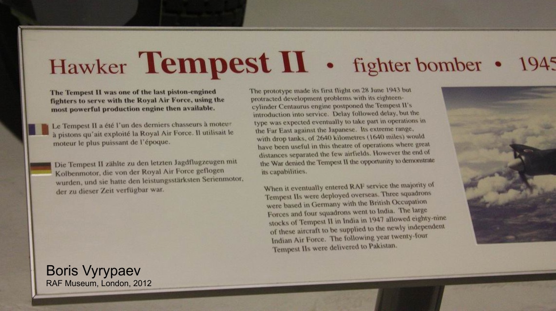 Остается добавить, что Темпесты MkII участвовали в первой индо-пакистанской войне. Причем с обеих сторон, в Индию и Пакистан они попали не в начале 50-х, а раньше.
