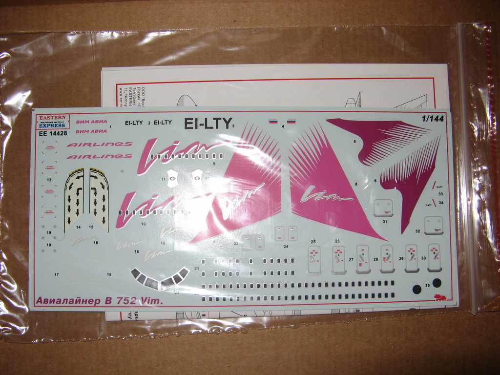 Красивая коробка, в которой поместились думаю бы два таких же лайнера. Как обычно у Восточного экспресса все детали сложены в один общий запаянный пакет, включая прозрачные. Отдельно идут красивая Бегемотовская декаль, и инструкция по сборке и окраске на двух листах формата А-5. Заставила улыбнуться инструкция по окраске))
