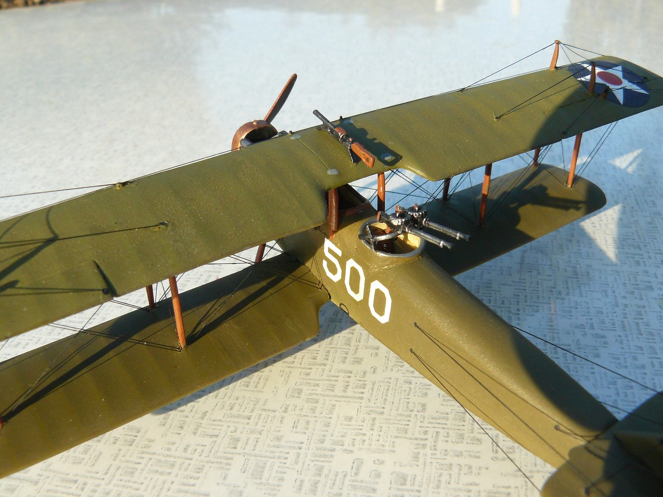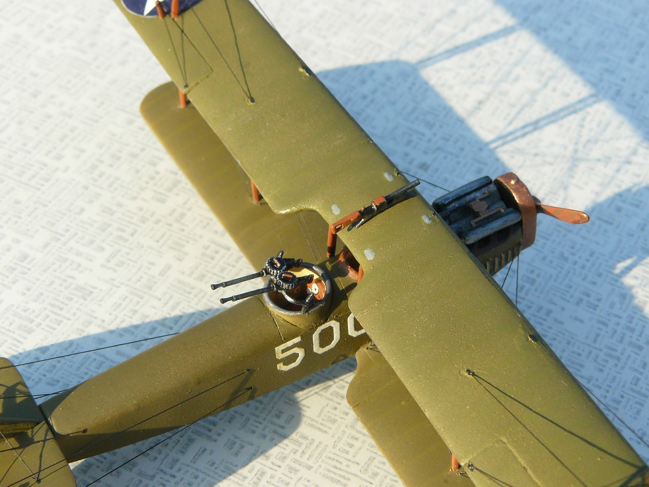 Коробка "прошита" 4 длинными кусками лески, хвостами лески, выведенными на верхнее крыло, расчалены верхние распорки. Окраска мр.Колор, аэрографом. Декали паршивые, толстые и хрупкие, но неплохо приварились спиртом, хоть кое где и пузырятся.