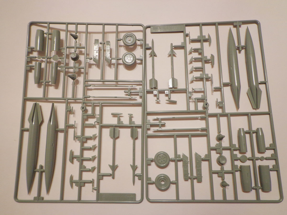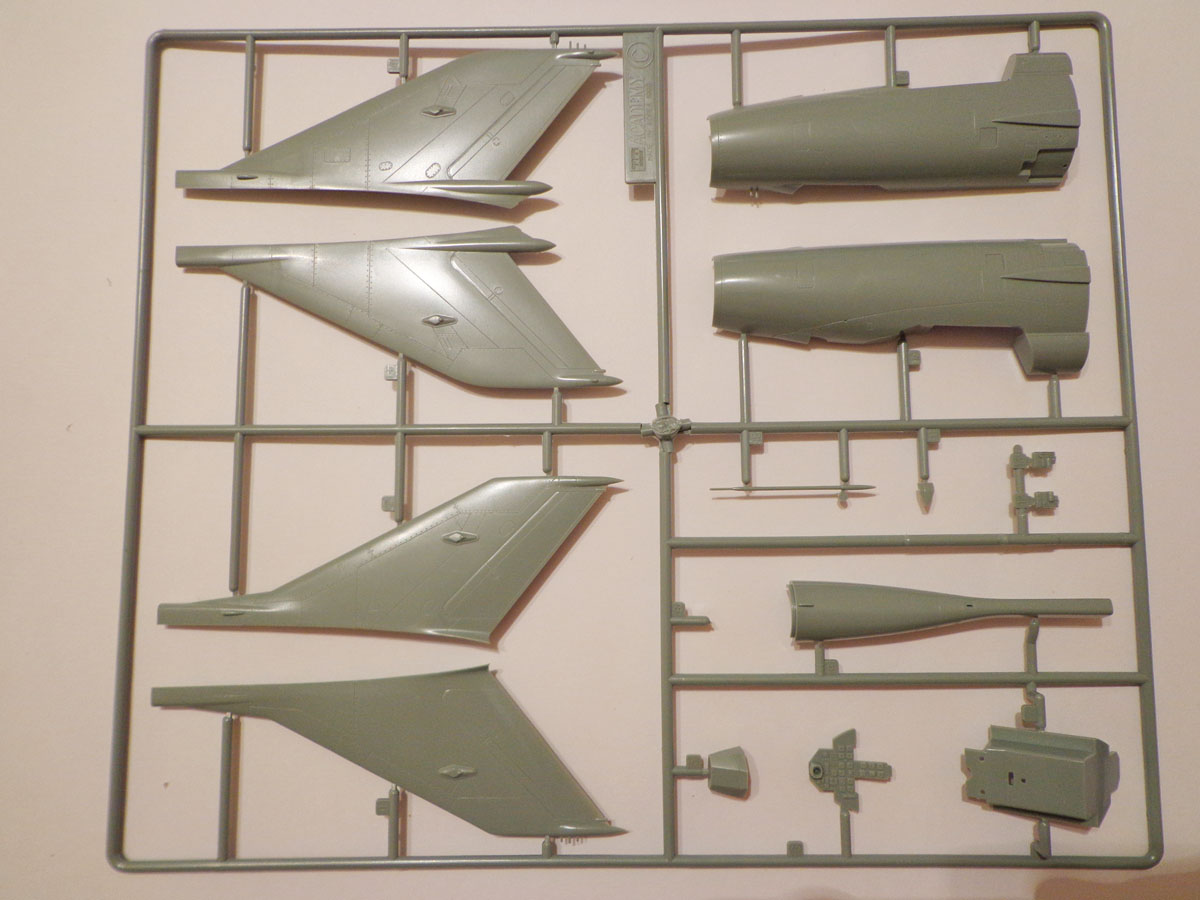 Модель всем известного советского истребителя второго поколения МиГ-21ПФ. В Каробке находятся пять литников плюс один с фонарём. Облоя самый минимум, расшивка тонкая и аккуратная. Проработка "мелочевки" можно сказать на уровне "средней паршивости", на том же уровне и геометрия модели (по отзывам моделистов), детали от литников не отделял и в чертежи не вкладывал, поэтому конкретнее по геометрии сказать не могу.