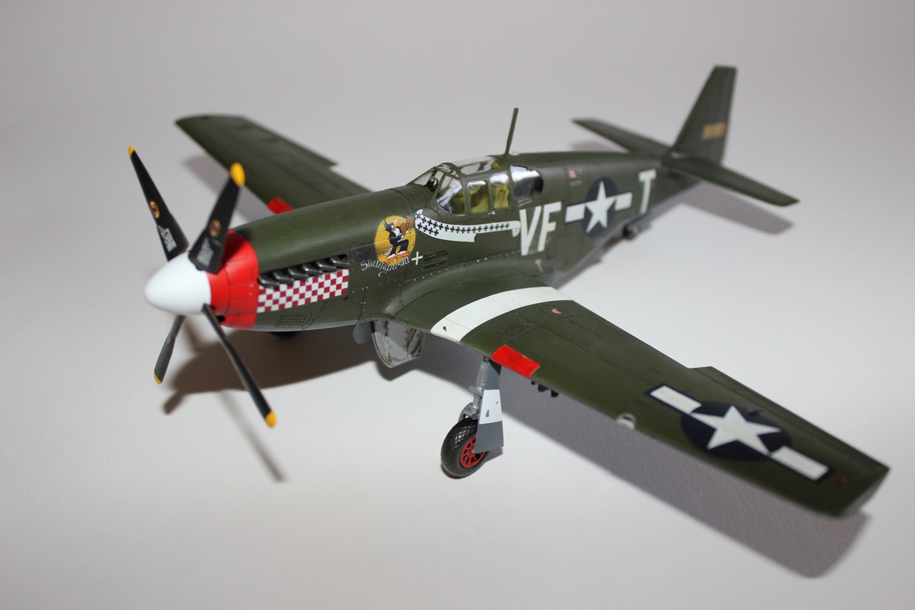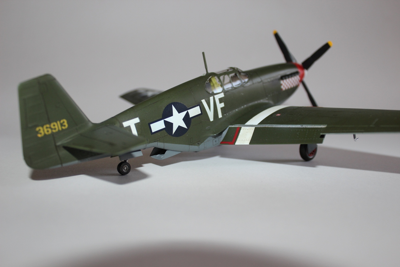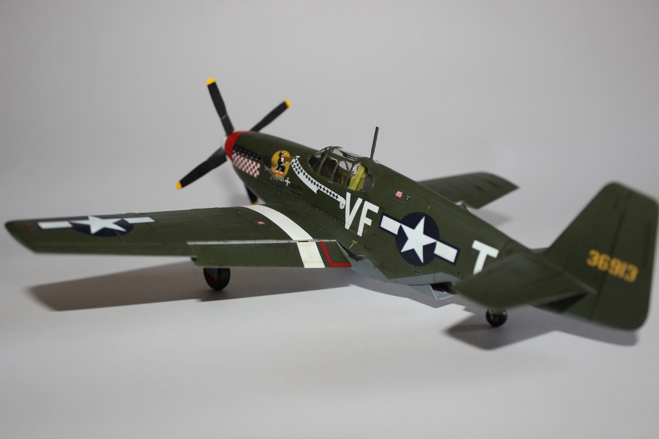 Из трех вариантов окраски, предлагаемых производителем, выбрал борт капитана Доминика Сальваторе Джентиле «Shangri-La» (очень уж понравилась птичка в боксерских перчатках и шашечки). Красил аэрографом в цвета ANA 613 «OliveDrab» и ANA 618 «NeutralGrey» из палитры водоразбавляемого АКАНа. Ниши шасси и внутренние поверхности окрашены «ChromateYellow», стойки шасси – X-11 «ChromeSilver» от «TAMIYA». Белые полосы на крыльях накрашивал аэрографом. Для выделения расшивки использовал художественную акварель цвета «умбра»+фэйри. Следы от выхлопа на фюзеляже наносил пигментами «TAMIYA». Сверху модель покрыта полуглянцевым лаком АКАН.