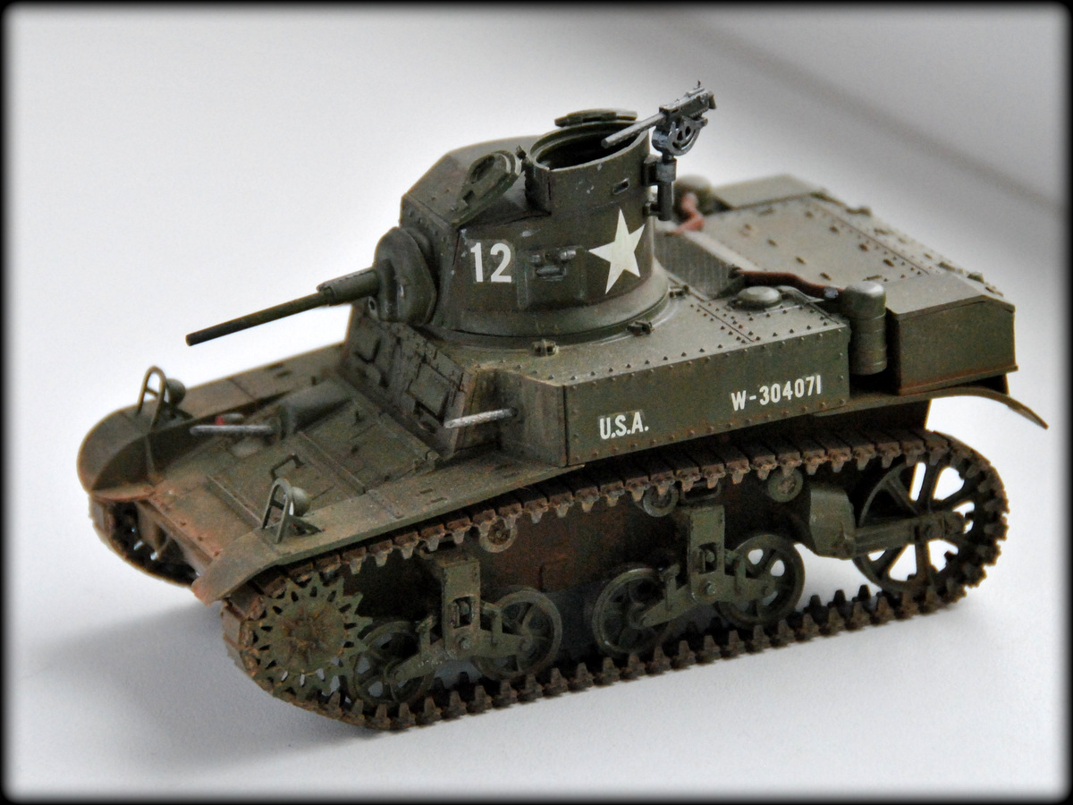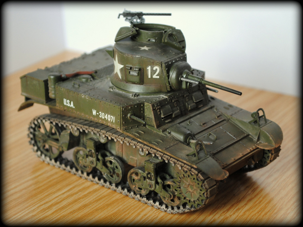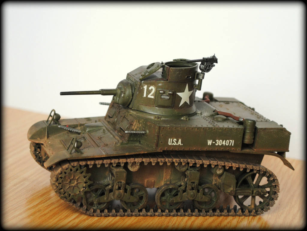Для первой очень неплохо. Теперь правильно научиться шпаклевать щели и постепенно улучшать окраску. И небольшое пояснение по матчасти: неправильно окрашены патрубки, они должны быть в базу, т.к. это патрубки-воздуховоды к воздушным фильтрам, а не выхлопные... А фильтра правильно окрашены в базу, а то некоторые их в ржавчину малюют... У "Стюартов" нет выхлопных патрубков как таковых, выхлопные газы выходят из кармана на корме (там, где лопата висит)