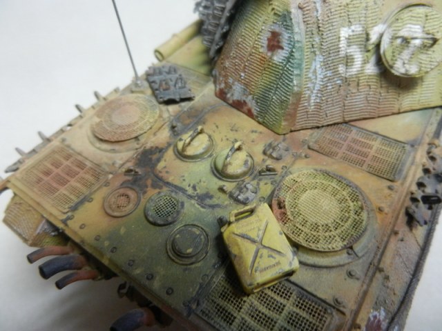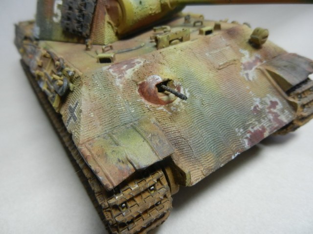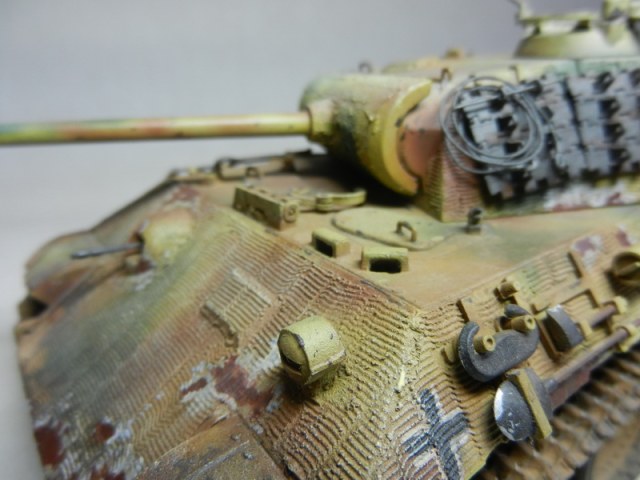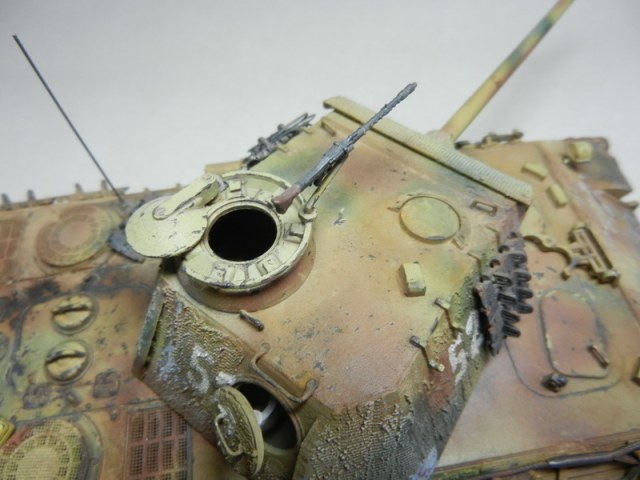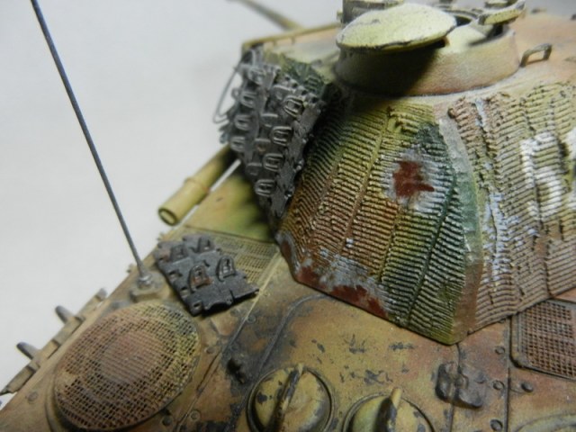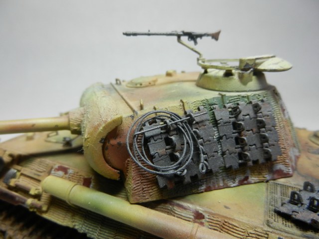 От сколов такое впечатление, как будто модель нечаянно уронили. Вы их потемней кисточкой мазаните и сразу будет другой вид. Выхлопные трубы, которые три, только средняя черная должна быть. И по циммериту, на башне, с переди, слева и с права от орудийной маски тоже стоило нанести. Я както делал и обратил на такой момент внимание. Может не у всех машин так было, но вид получается получше. А в общем и целом неплохо!