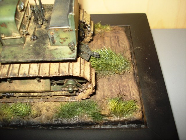 Приятная виньетка получилась! Кстати мне следы трактора хорошо видны. Но, как выше написали, как то сиротливо один трактор смотрится. надо было бы ему что то прицепить, ну или бульдозер сделать.. А тракториста с беломориной придется делать только бойца, т.к. трактор зеленый, в народном хозяйстве в армейском цвете тракторов не было..