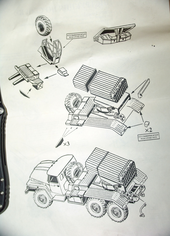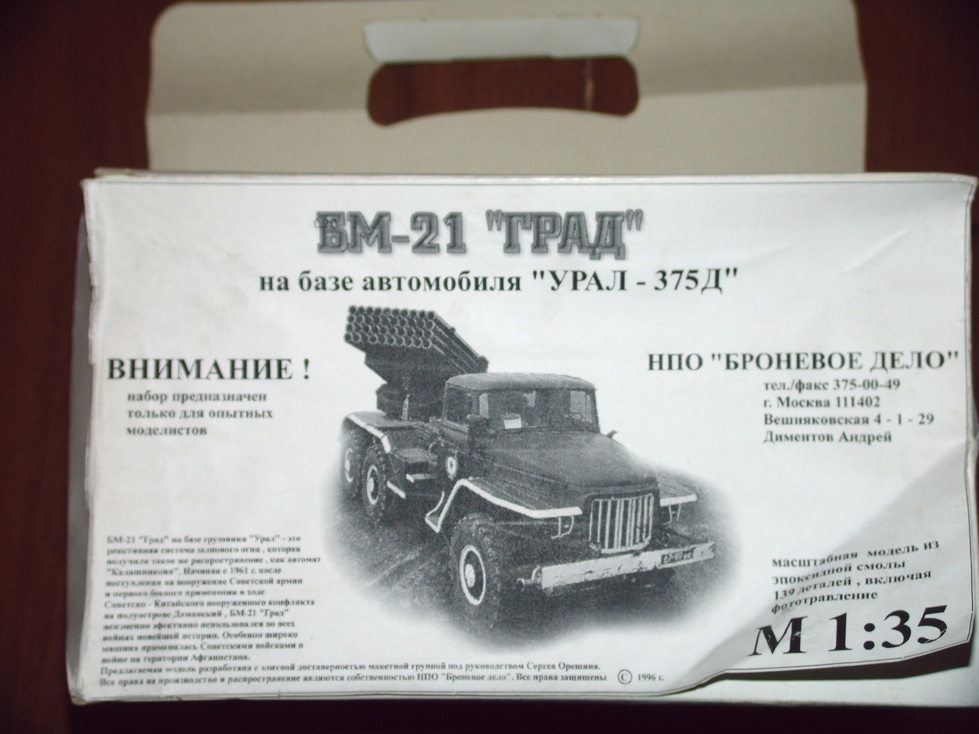 Еще одна очень редкая модель - Урал 375 Д "Град" от НПО Броневое дело. Выпускался когда и Зил 131, примерно в 94-95 году. По тем же причинам большой дороговизны, дальше пробной партии в 15-20 наборов дело не пошло. Мне достался набор немного не комплектный. отсутствовала сама установка Град, но это меня не сильно расстроило :)