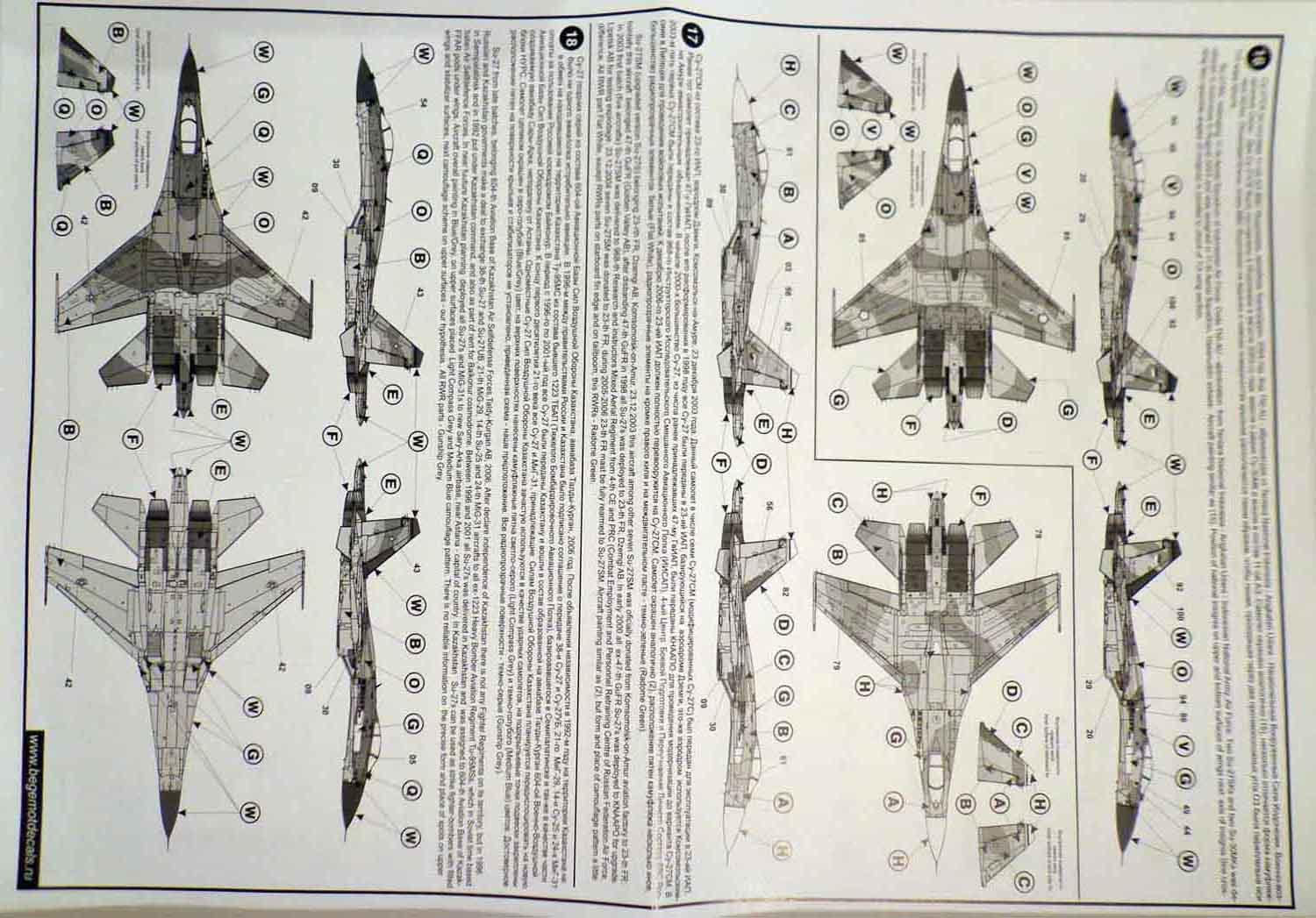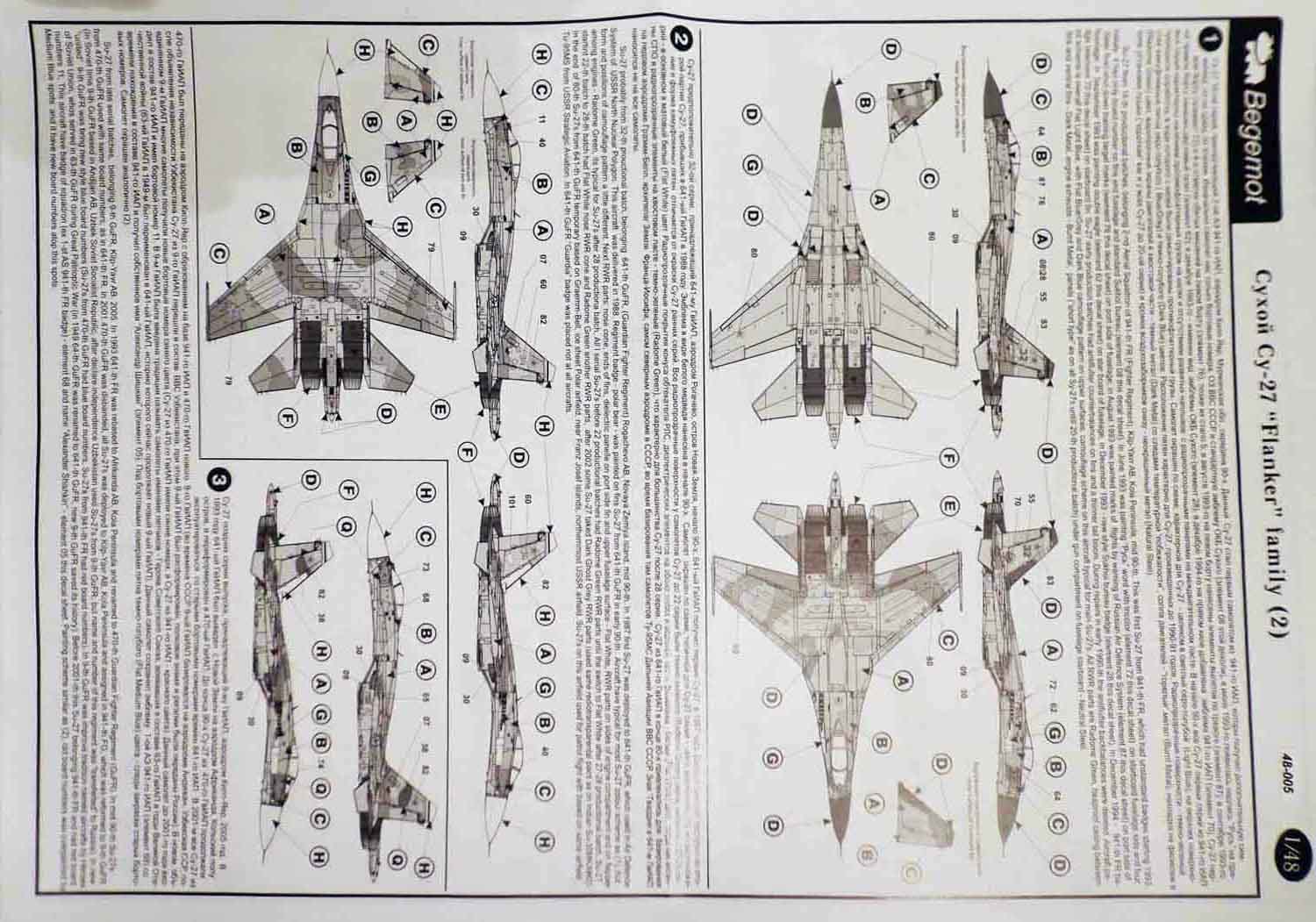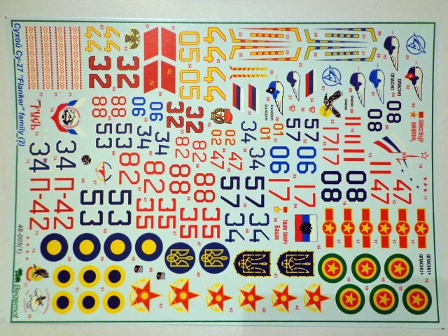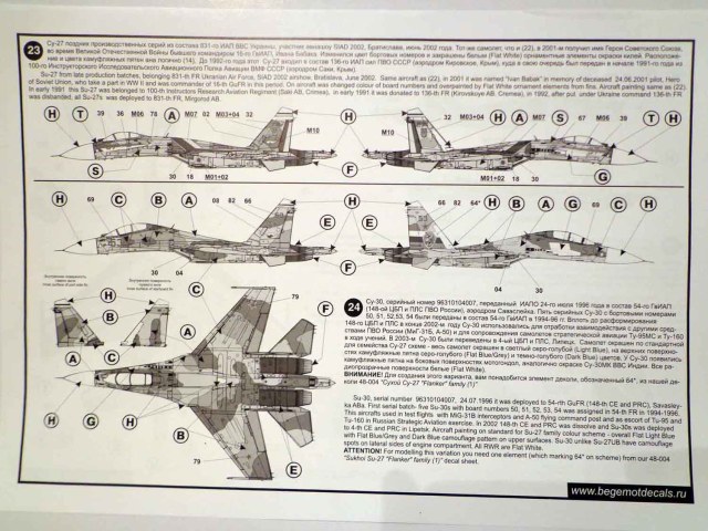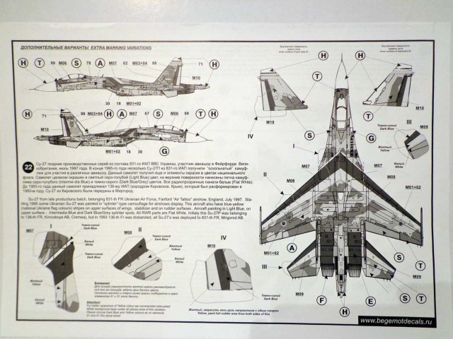Декали от всем известной фирмы "Begemot" для Су-27. В пакетике находится подробная инструкция на русском и английском языке, краткое описание прототипа, его история, место дислокации так же схема нанеения камуфляжа и его цвета. Два листа непосредственно с самими декалями и лист с трафаретами.