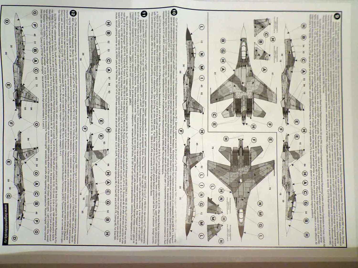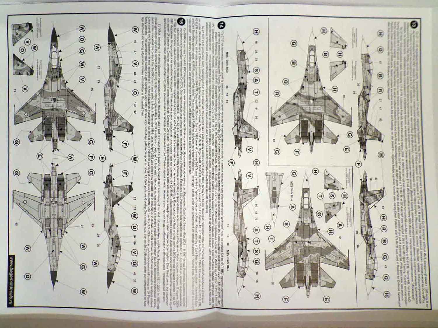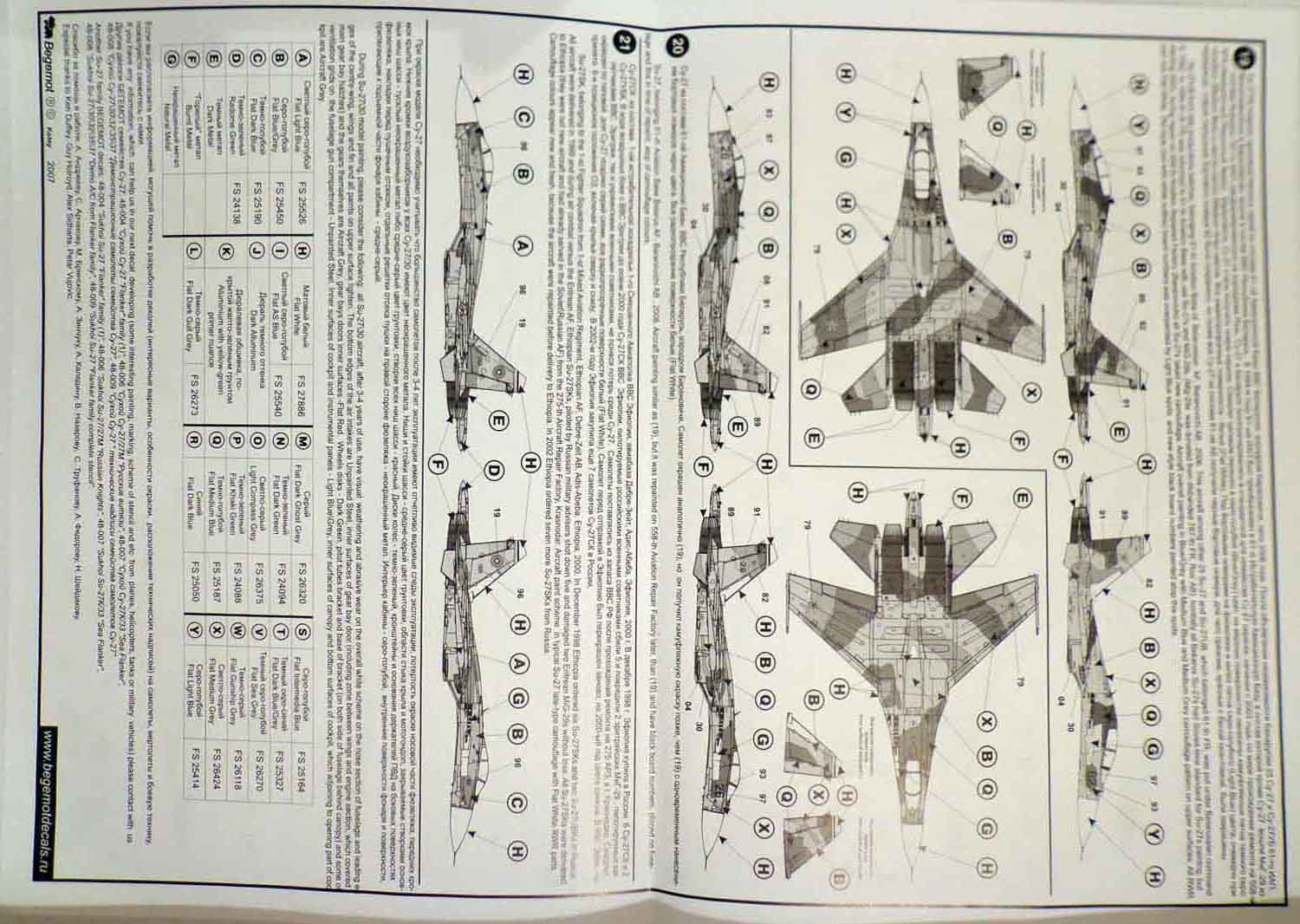 Декали от всем известной фирмы "Begemot" для Су-27. В пакетике находится подробная инструкция на русском и английском языке, краткое описание прототипа, его история, место дислокации так же схема нанеения камуфляжа и его цвета. Два листа непосредственно с самими декалями и лист с трафаретами.