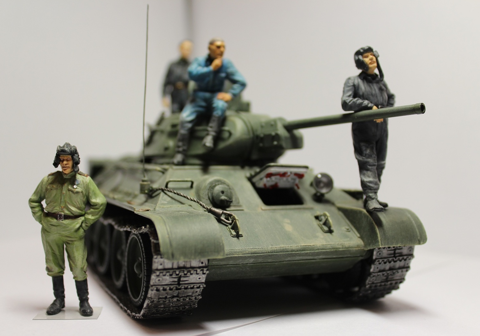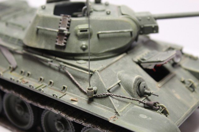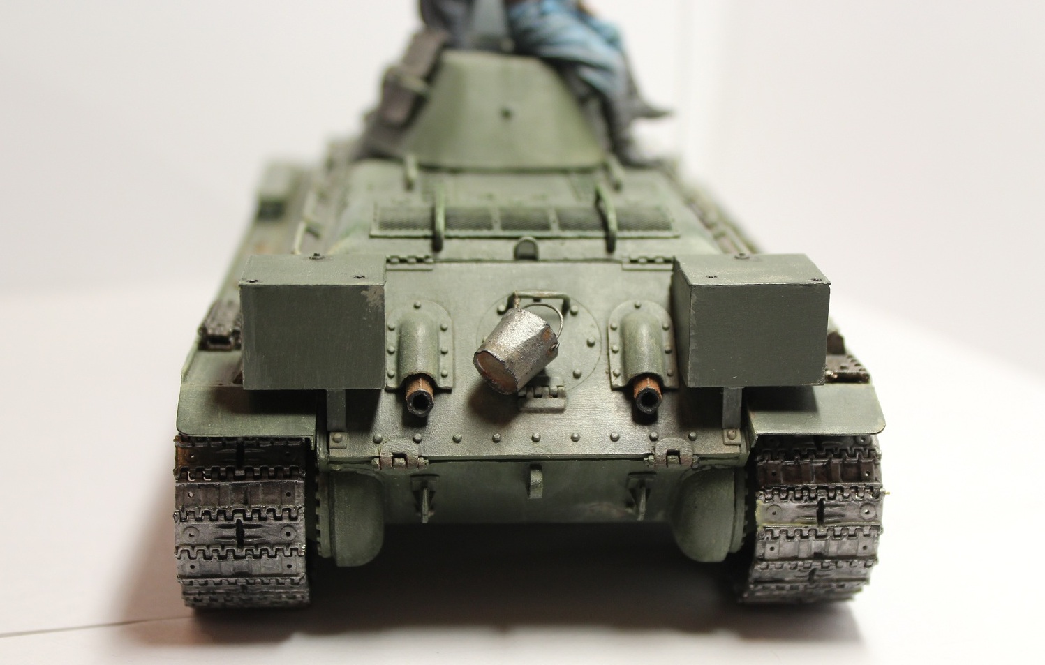 Мне очень понравился танк. Но он неоднозначный. Бывают, на мой взгляд, редкие случаи, когда отсутствие смывки не совсем бросается в глаза. Вроде как и надо её делать, а машина и без неё неплохо смотрится. Создаётся впечатление новой 34-ки, только что прибывшей на фронт из цехов. А ведро уже успели повесить)))