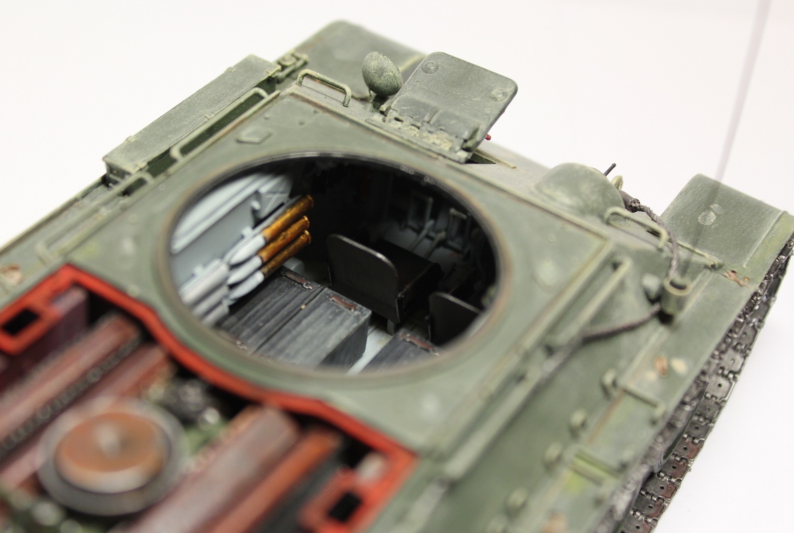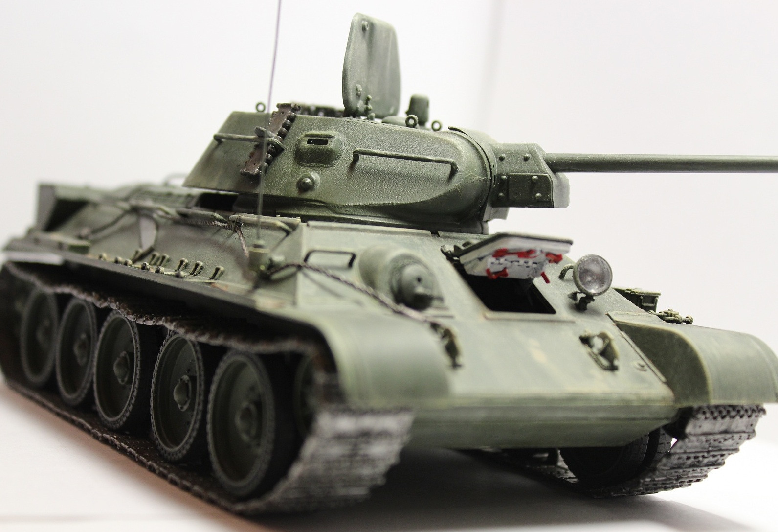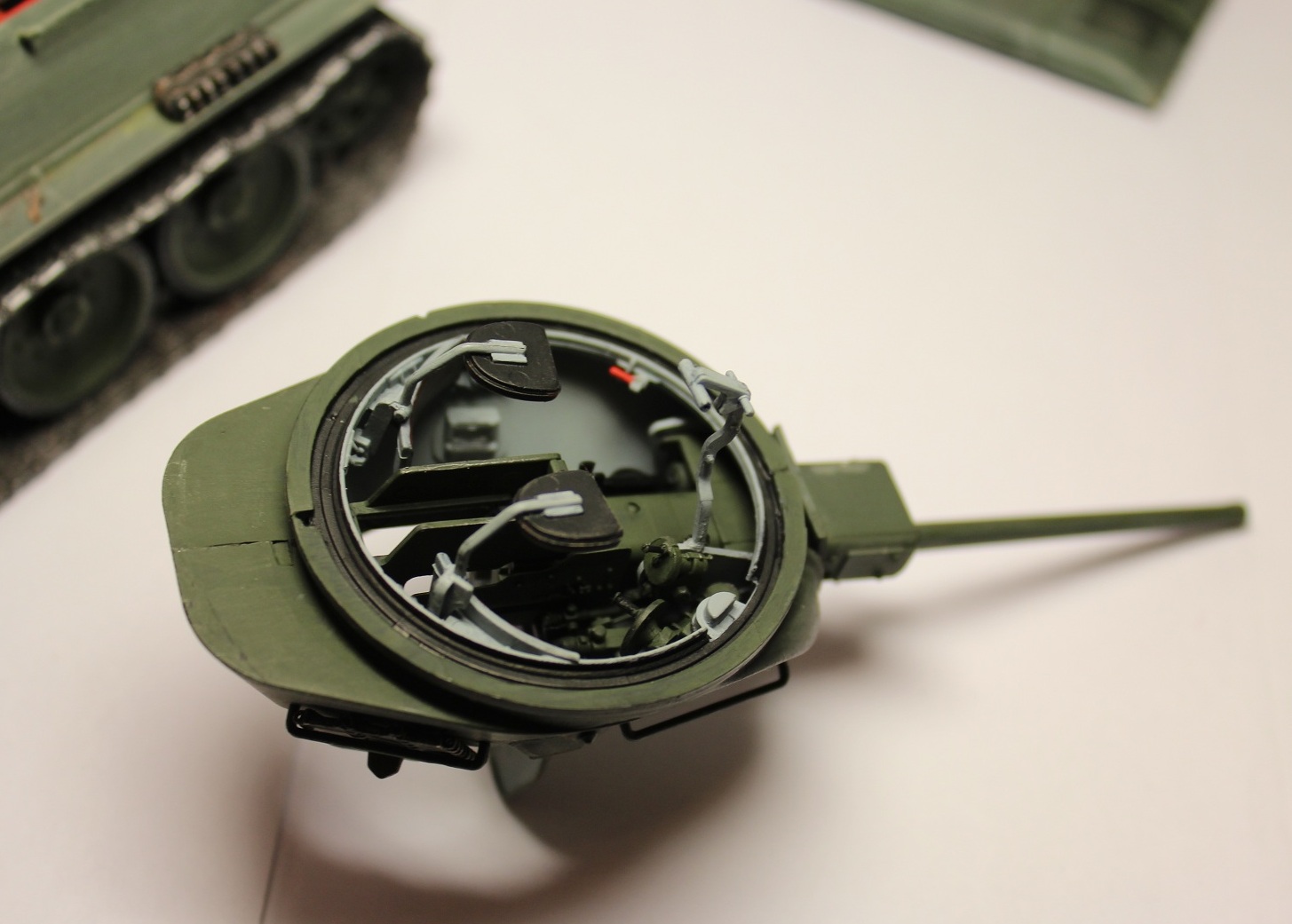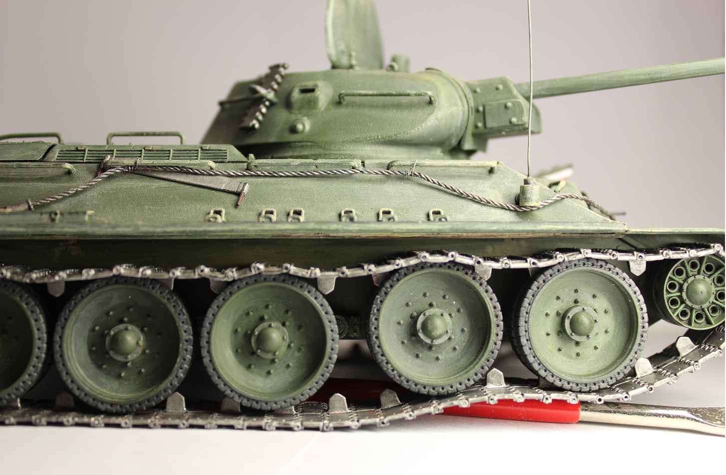 Спасибо Вам за добросовестную работу. Устал уже от издевательств над Тридцатьчетвёрками. Траки правда, эти для Сормова не характерны. На будущее - пластиковые скобы для шпор меняйте на самодельные проволочные. Ну и за что меня самого только что побил Макаров - не было на Сормовчанках врезных планок!!! (но всё-таки я ещё раз съезжу на Поклонную - убедиться). Ручка на люке ТО чрезмерно велика.