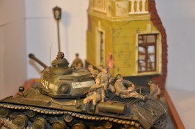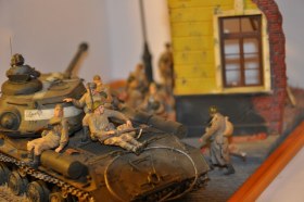 Сюжет диорамы такой. По улице Берлина продвигается танк, с небольшим отрядом пехоты( как и во многих других танковых бригадах, в 7-ой Гв. ТТб были небольшие отряды пехоты для сопровождения танков и борьбы с фаустниками). Солдаты идут уставшие после изнурительных боев за Берлин, и вдруг неожиданно нарываются на очаг сопротивления из четырех солдат фольксштурма, среди которых фаустник. Вроде бы и Берлин взят, и война закончилась, но есть еще фашисты преданные своей идеологии, которые не дают покоя советским солдатам, появляясь то тут, то там, в виде небольших отрядов или единичных снайперов. Каждый додумает сам, чем же закончится этот бой...