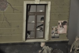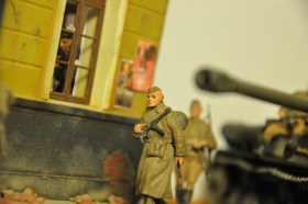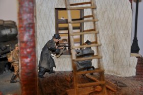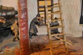 Куда метит фаустник на 2-ом этаже (фаустпатрон неверно покрашен)? да и автоматчик рядом? Ведь танк и русские солдаты внизу? И, кстати, танкист из люка их должен был видеть, когда проезжал - стена то разрушена...