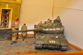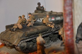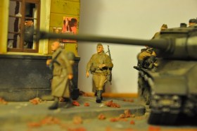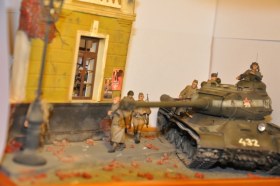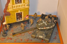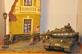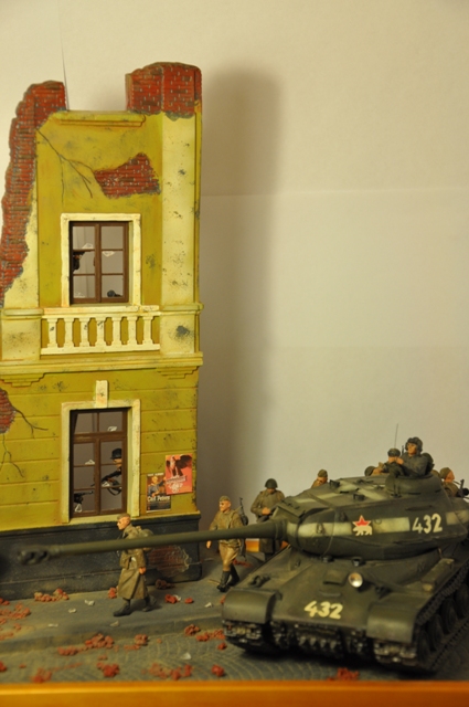 Поначалу была задумка сделать подставку под танк ИС-2 и добавить танковый десант с пехотой. Но потом во время стройки я как-то задумался над смыслом своей диорамы, и понял, смыла то в ней нет почти никакого: ну едет танк, ну идут солдаты, а толк-то где, нет динамики. И тогда я решил добавить в эту диораму немцев из отрядов фольксштурма. Они отображают один из последних очагов сопротивления в Берлине, в мае 1945 г.