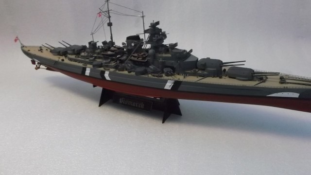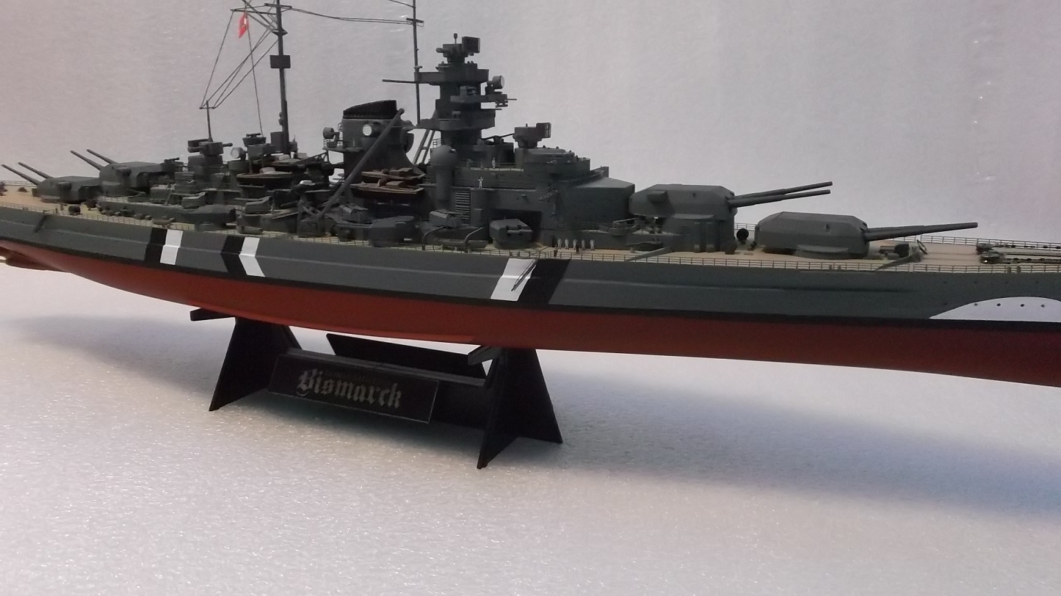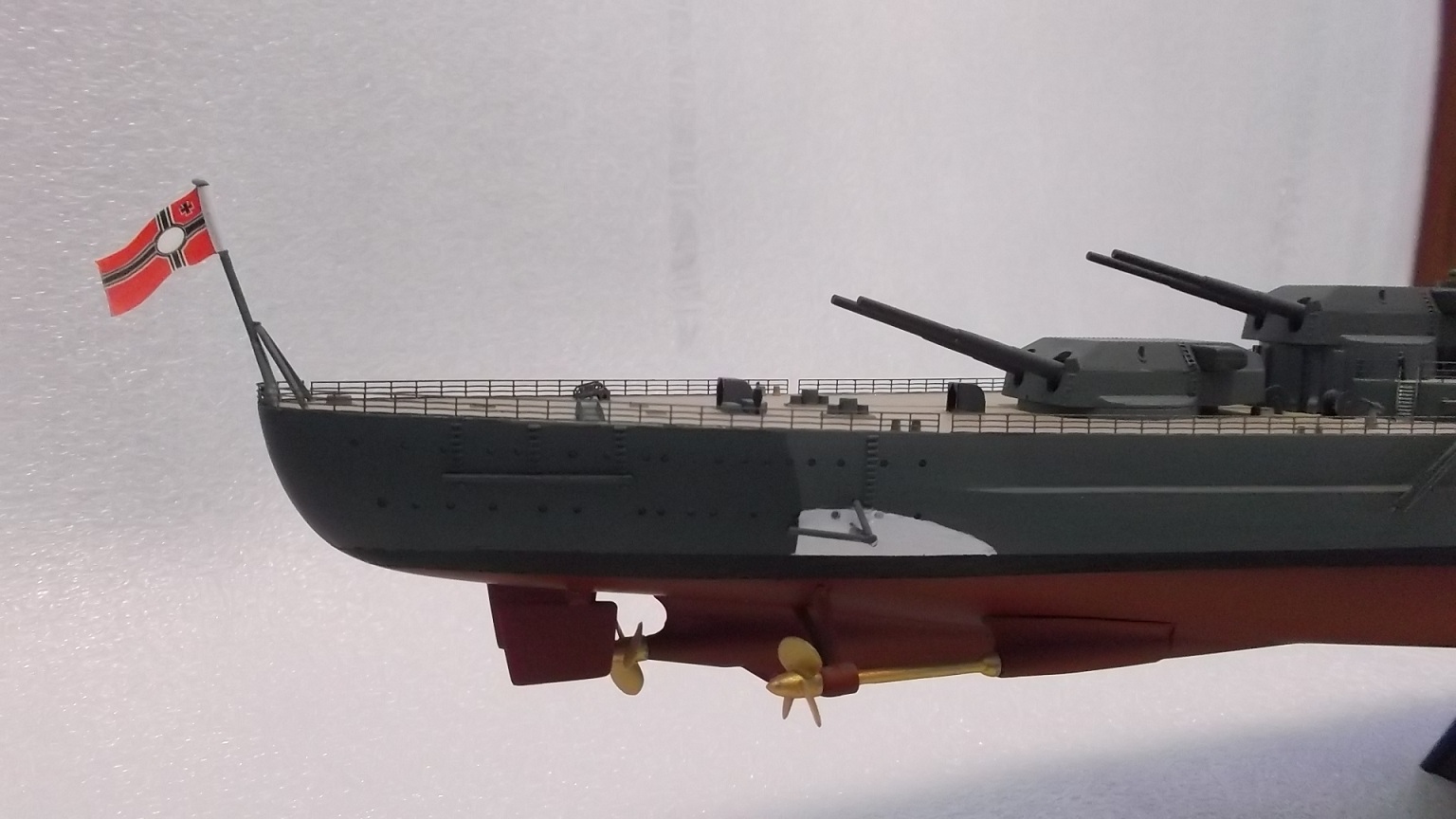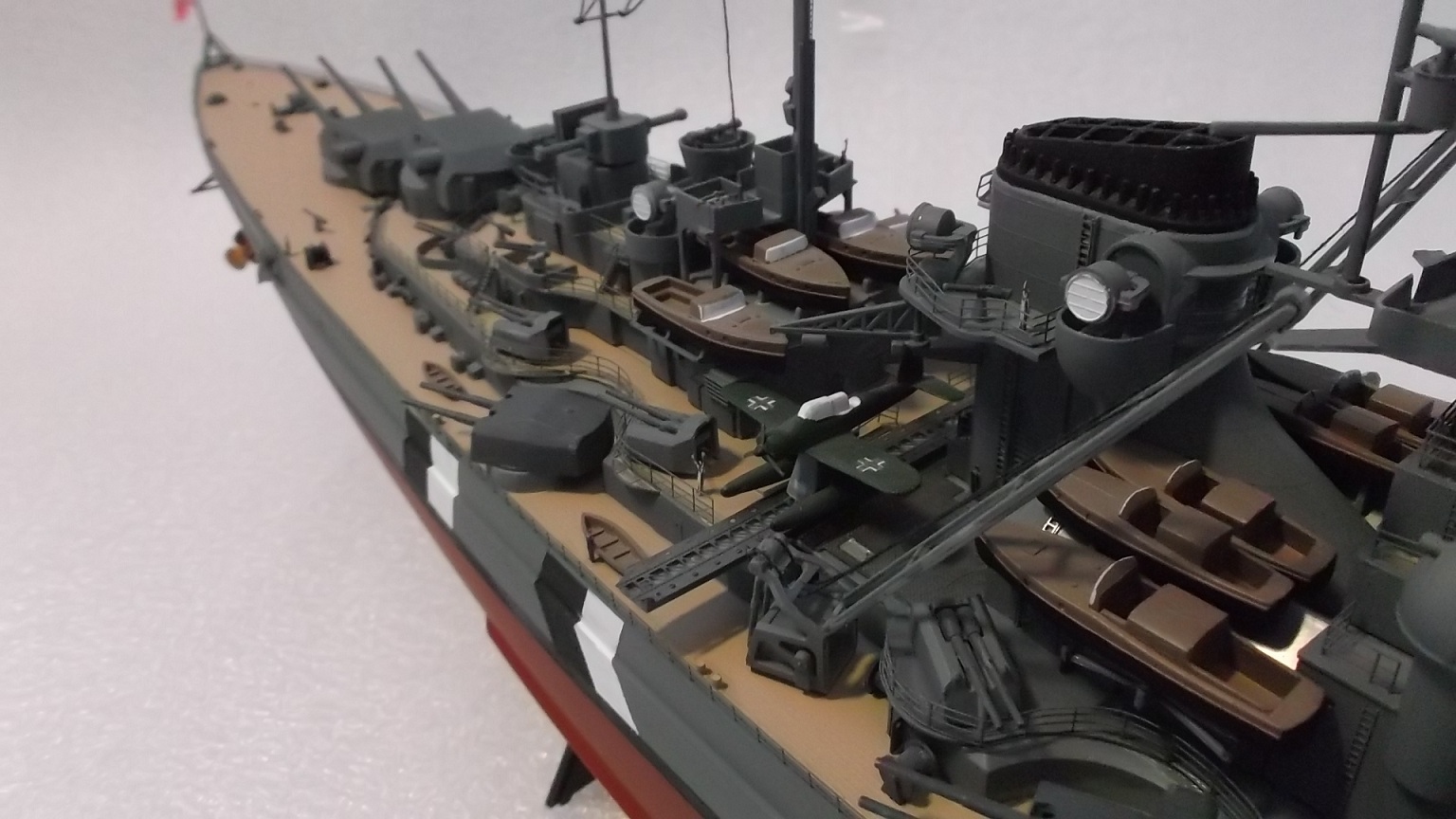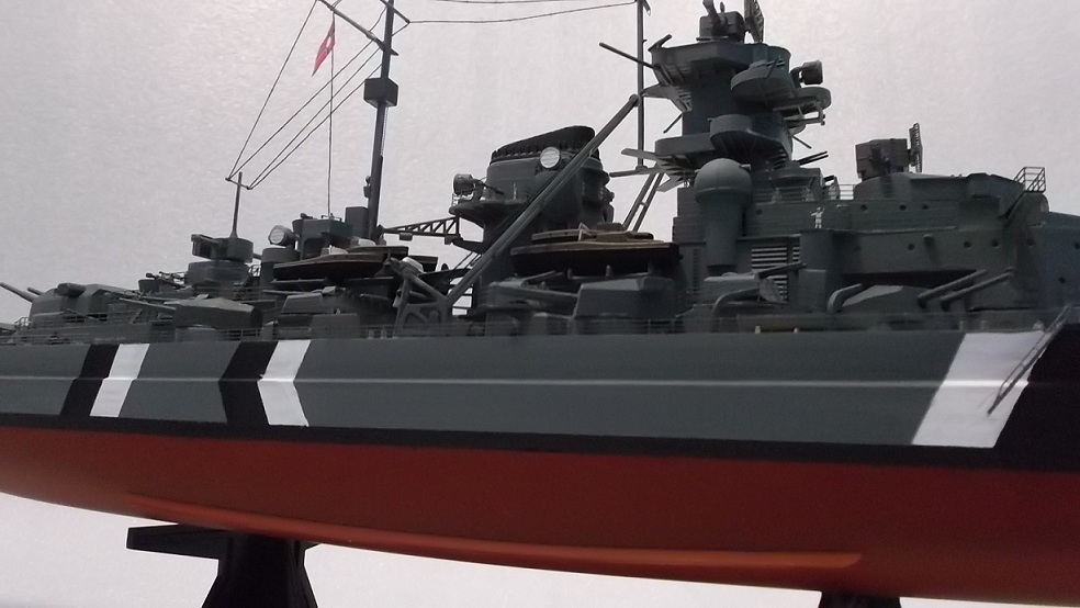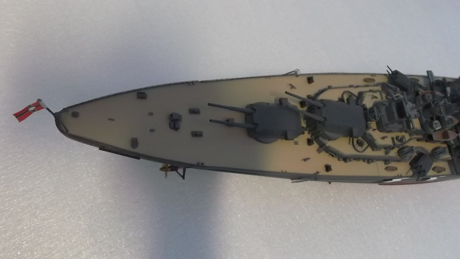 По мадели- достаточно аккуратно и собрана (есть щели меж палубой и надстройкой, швы на палубе) и покрашено (монотонно). Но вот от ощущение, что ет "мёртвый" корабль, у меня не проходит, экипаж ни разу не спасает положение вещей. Эт не Бисмарк, а его призрак. Я против галереи.