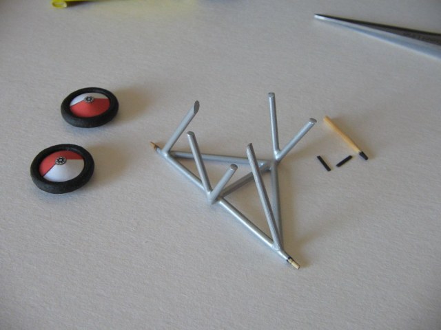 Кожух двигателя зашпаклёван и покрашен, тележка шасси из зубочисток, собрана на суперклее и покрашена. Тросы - банально обычная нить, уже не стал особо заморачиваться... Также немного поправил профиль крыла.