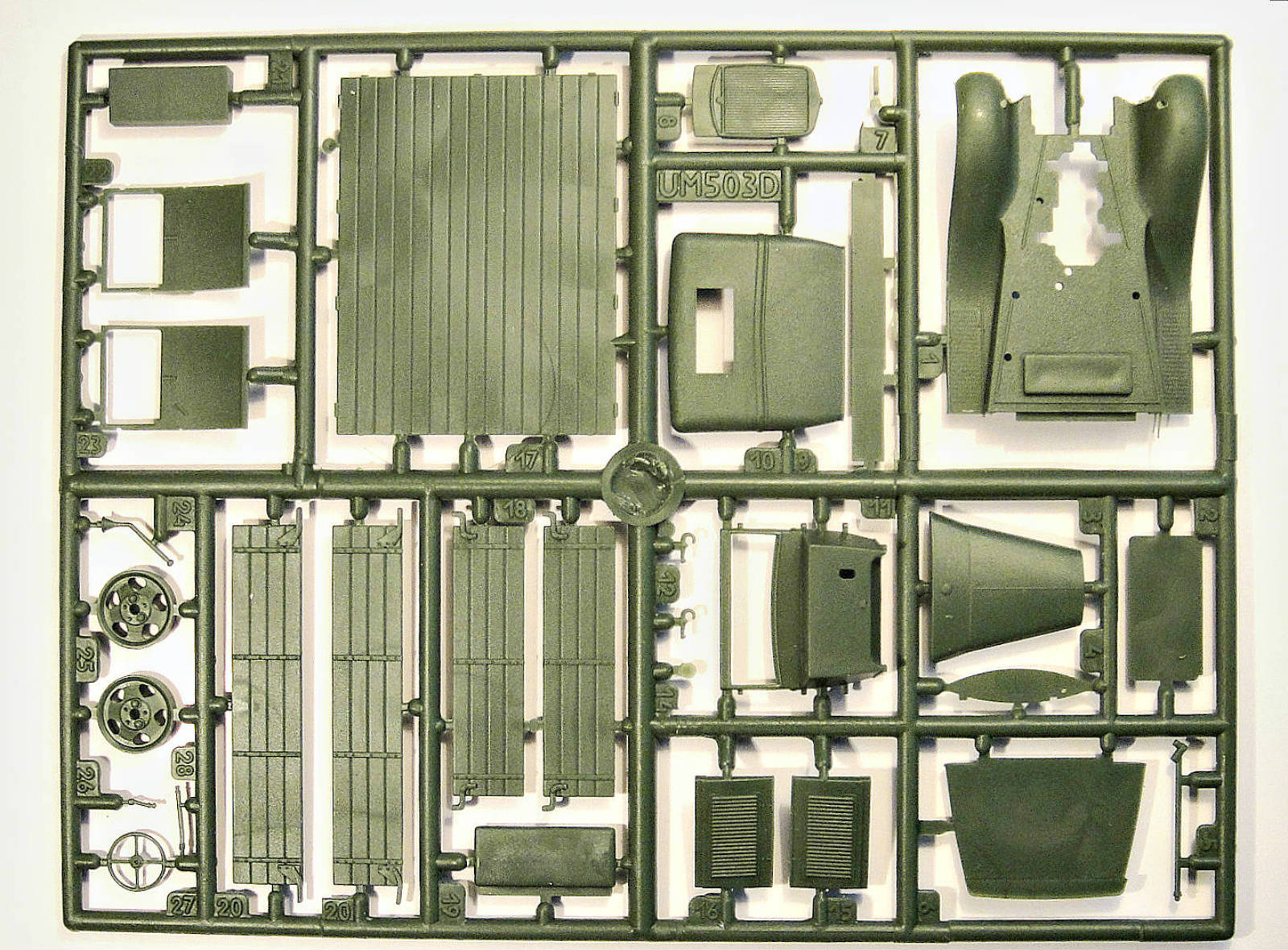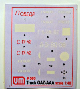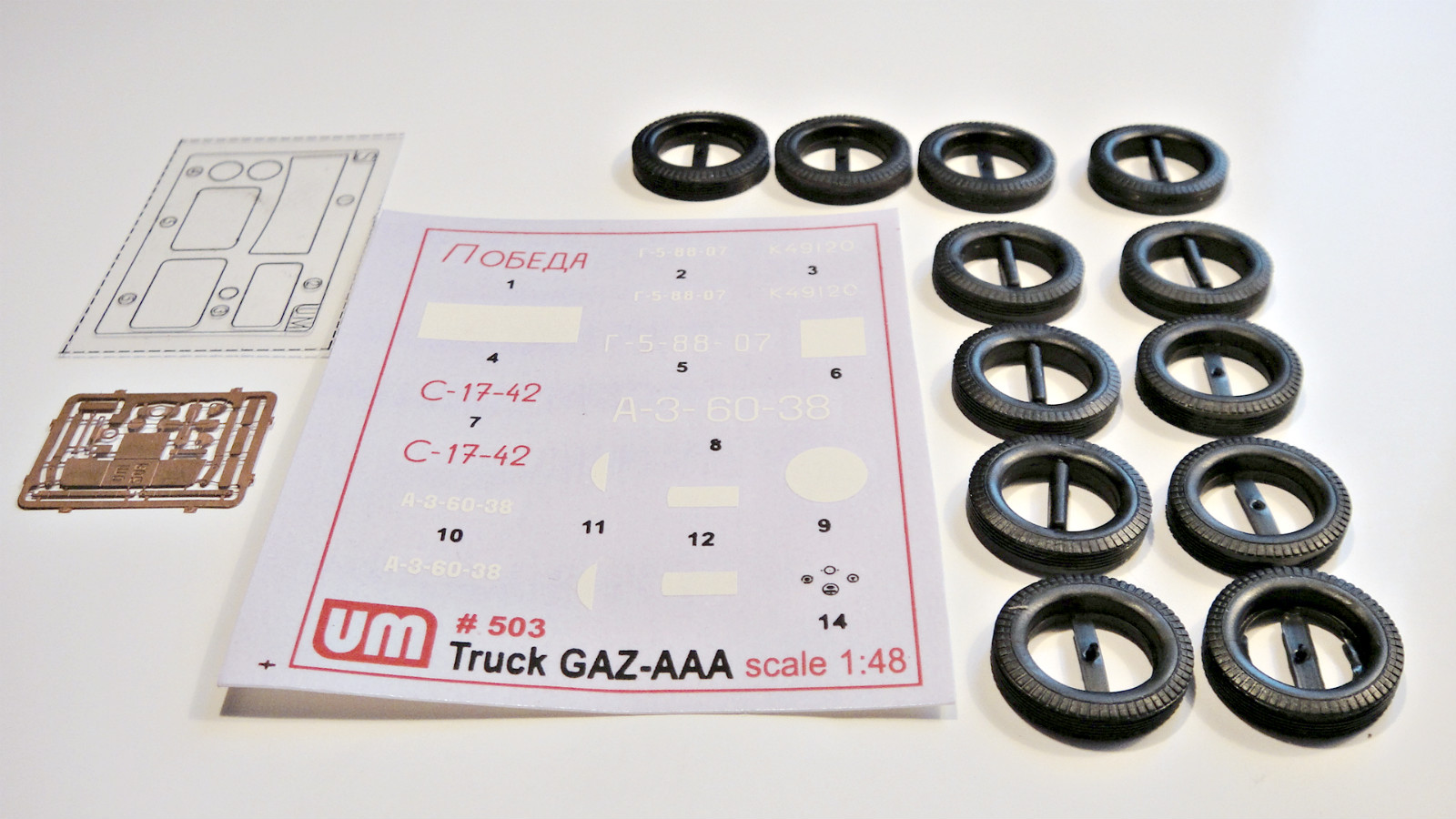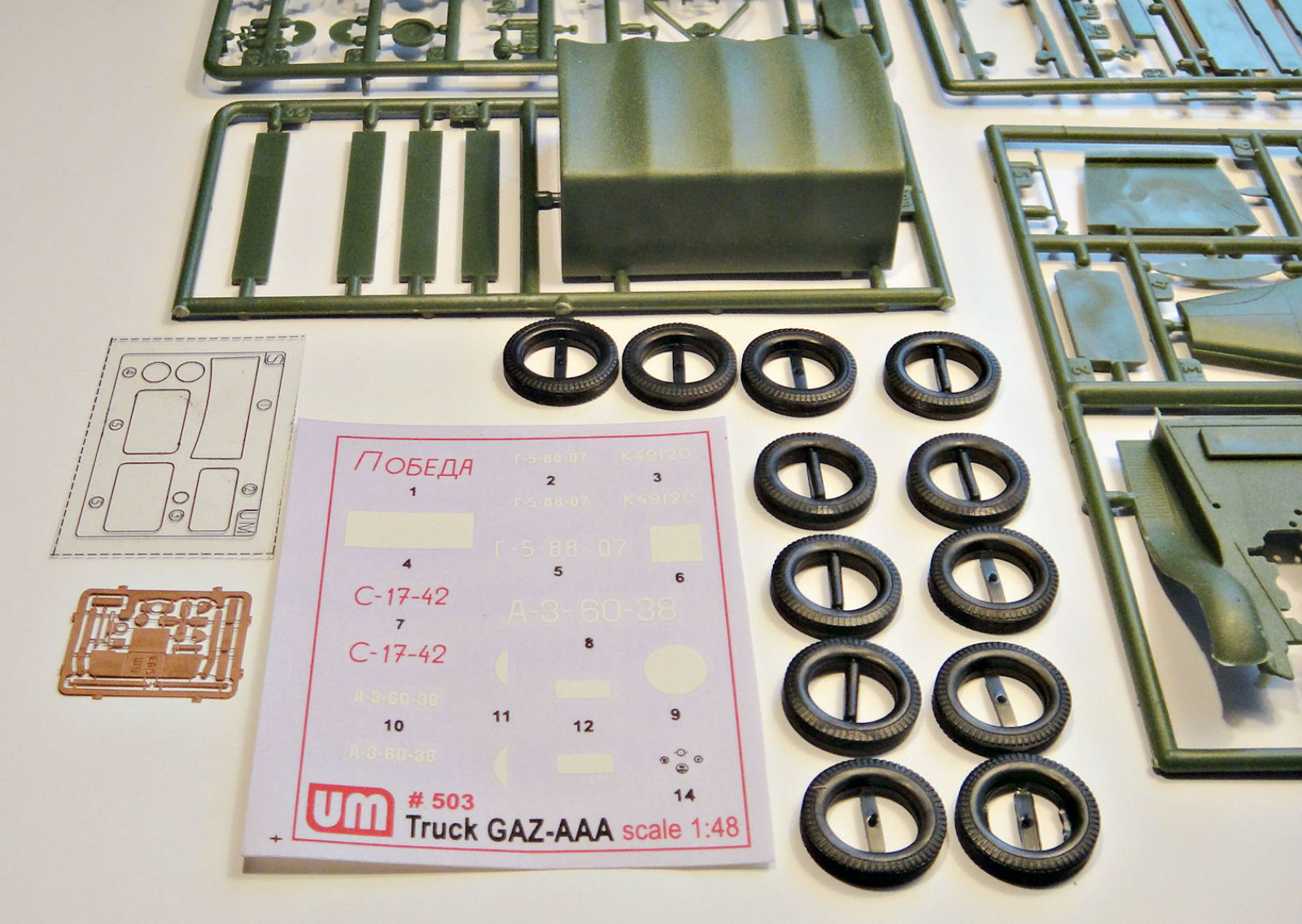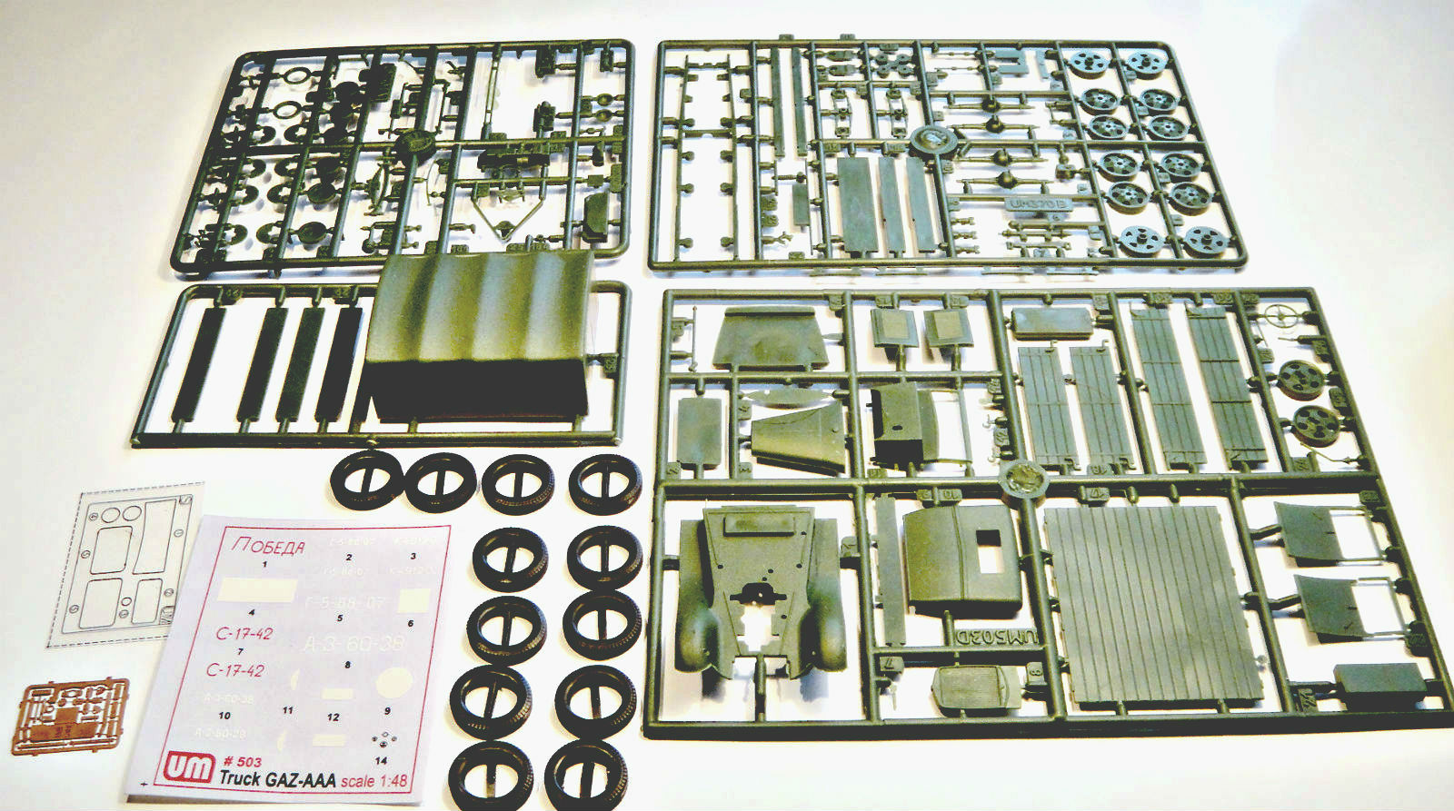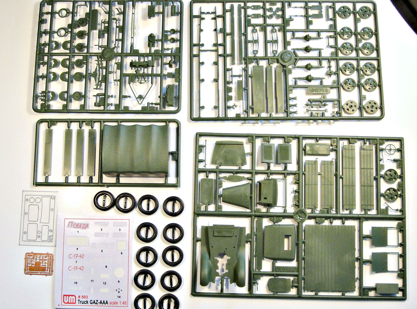 Приветствую Вас коллеги! Хочу представить набор грузовика ГАЗ-ААА от UM в масштабе 1/48. В наборе имеется четыре рамки литников с деталями, небольшая плата фототравления, прозрачная пленка со "стеклами" и резиновые покрышки. Качество литья хорошее, на деталях кабины и тента имеется мелкая шагрень, которая легко убирается. Дана декаль на четыре варианта. Отдельно собирается двигатель, который можно оставить, как в открытом, так и в закрытом положении, правда в открытом виде створки нуждаются в доработке,так как смотрятся толстовато.