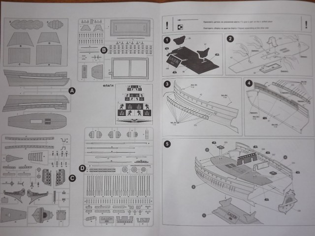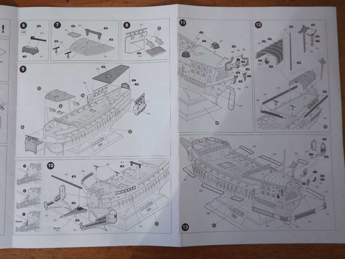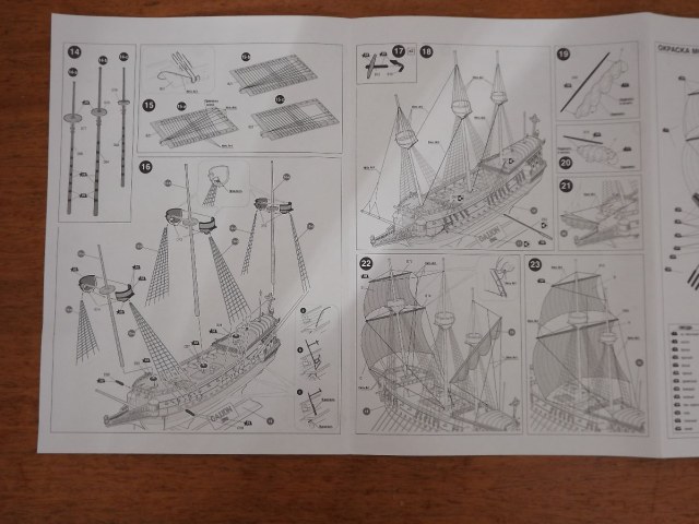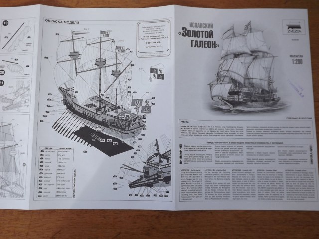 Также в наборе присутствуют пластиковые паруса, бумажные флаги и нитки. Нитки такие же, как и в наборе Виктори – скользкие и постоянно расплетающиеся. Инструкция, особенно по сравнению с оригиналом Heller, достаточно понятная, весь процесс разбит по шагам. Разве что схема окраски корпуса сделана несколько запутанно – в паутине линий-указателей не все понятно. В общем-то набор понравился, хотя некоторые моменты вызывают удивление, особенно наличие весел. Я еще не видел подобных галеонов.
