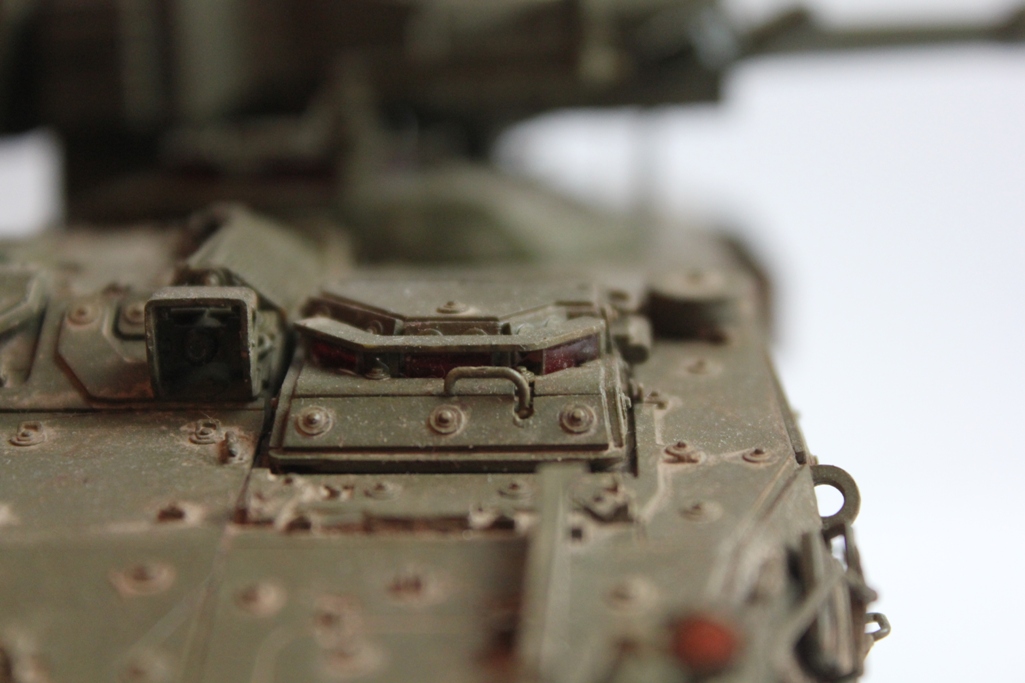 По сборке : красил Тамией , пигменты и смывка МИГ . Из доработок только антенны , хотел сделать проводку к дымовым шашкам , но был так увлечён сборкой , что потерял чувство скорости и очнулся когда модель была уже покрашена и "запигментена" . Попытался изобразить запылённый БТР, который попал под дождь и проехавший по жидкой грязи ( марш по раскисшей грунтовой дороге ) и потом обсохшем на стоянке .