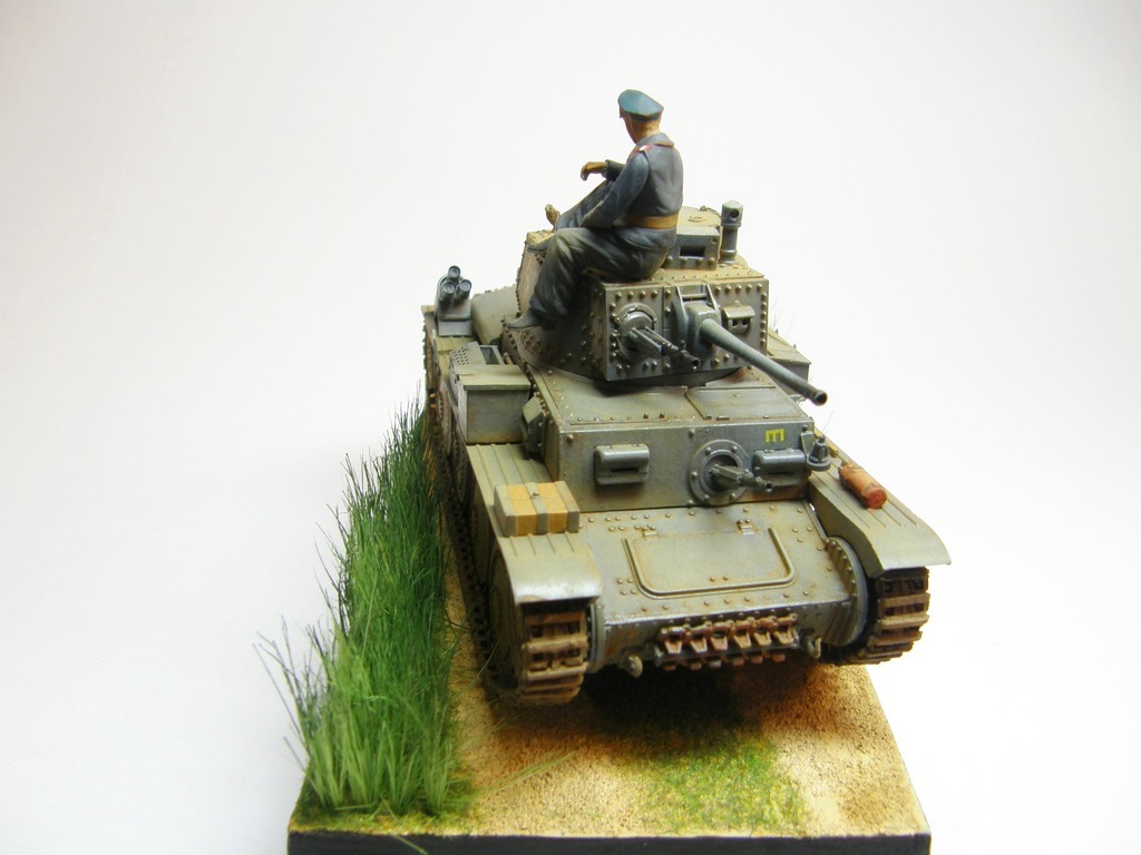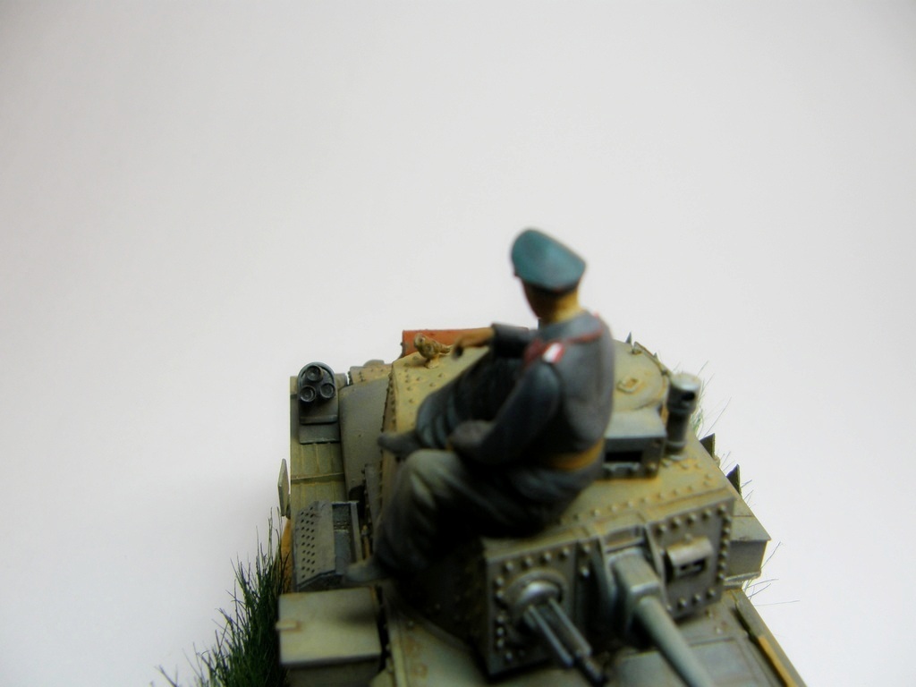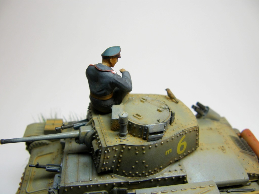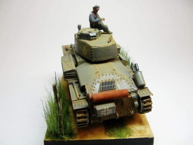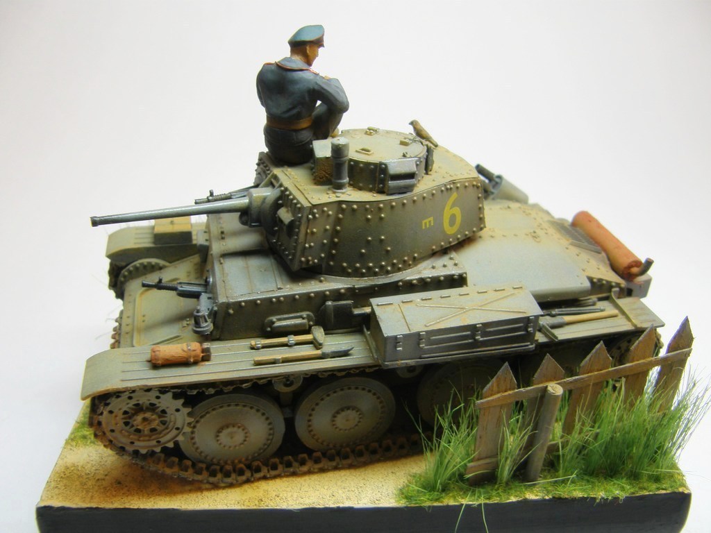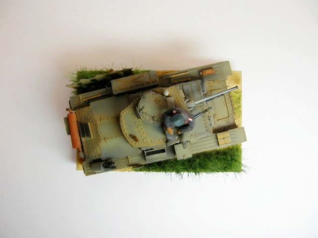 Основную часть композиции составляет танк "Прага", из коробки, окрашенный красками АКАН. Это моя первая модель сделанная со всеми технологиями которые я узнал за пару месяцев. Танкист и птичка взяты из набора Tamiya №35201, окрашивались темперными красками . У танкиста изменил положене головы. Это моя четвертая фигурка.