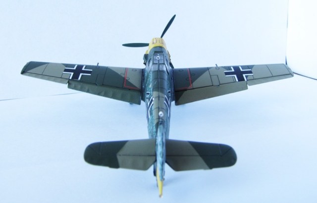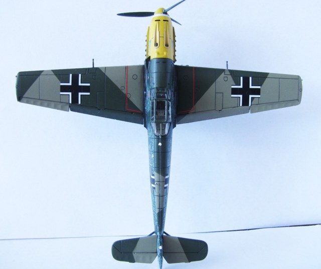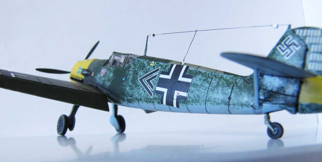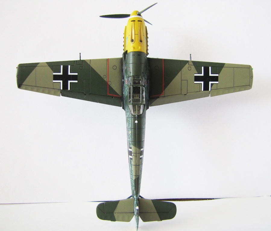 Модель была загрунтована тамиевским грунтом,потом окрашена водным Аканом в основные цвета камуфляжа.Далее покрыл слоем лака и торцом коротко обрезанной кисти нанёс "веснушки" на борта,далее ещё слой лака и шлифовка ,затем ещё слой лака,декали,ещё слой лака,смывка маслянная краска на бензине.Финишное покрытие матовый лак Microscale.Пачкал тамиевскими пудренницами,пигментами Мастер-пигмент,маслянными красками на бензине и тамиевским Smoke.Декали часть из набора,часть от Bf.109E Tamiya.