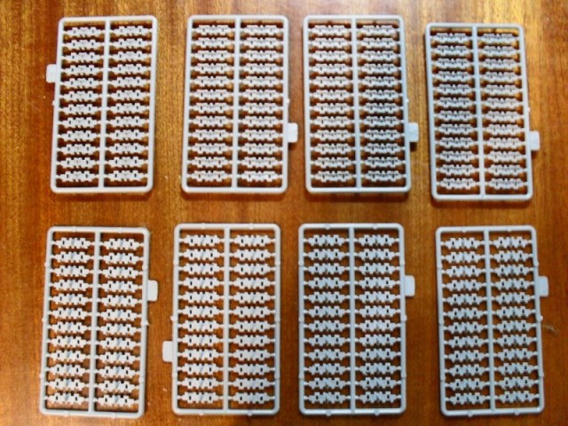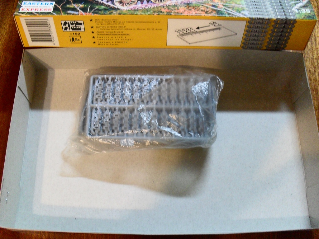 Небось всем знакомые по карману эти улётные наборчики ВЭ, однако обзора на них я не нашел. Ну в принципе и так понятно и все же: в коробке присутствуют целых 8 уплотненных рамок с траками, по 24 на каждой, и того всего 192 трака. По качеству даже удивился - почти ни какого облоя на деталях, что даже неожиданно это от самого ВЭ! Только крохотные излишки торчат на левой оси траков, и то не на всех. И сам пластик по-прочней, чем как обычно. Открыв набор, решил пойти на экстрим - сфорганил первые 4 трака подвижными: протыкал иглой, закрепленной на насадке, потом вдел через траки очень тонкую медную проволоку - и ни чего так, получилось! Естественно очень нудно и долго, притом еще по пальцам себе не раз стрельнешь, но пока не пострадал) Хочу всю гусь попробовать сделать такую - да, я маньяк!