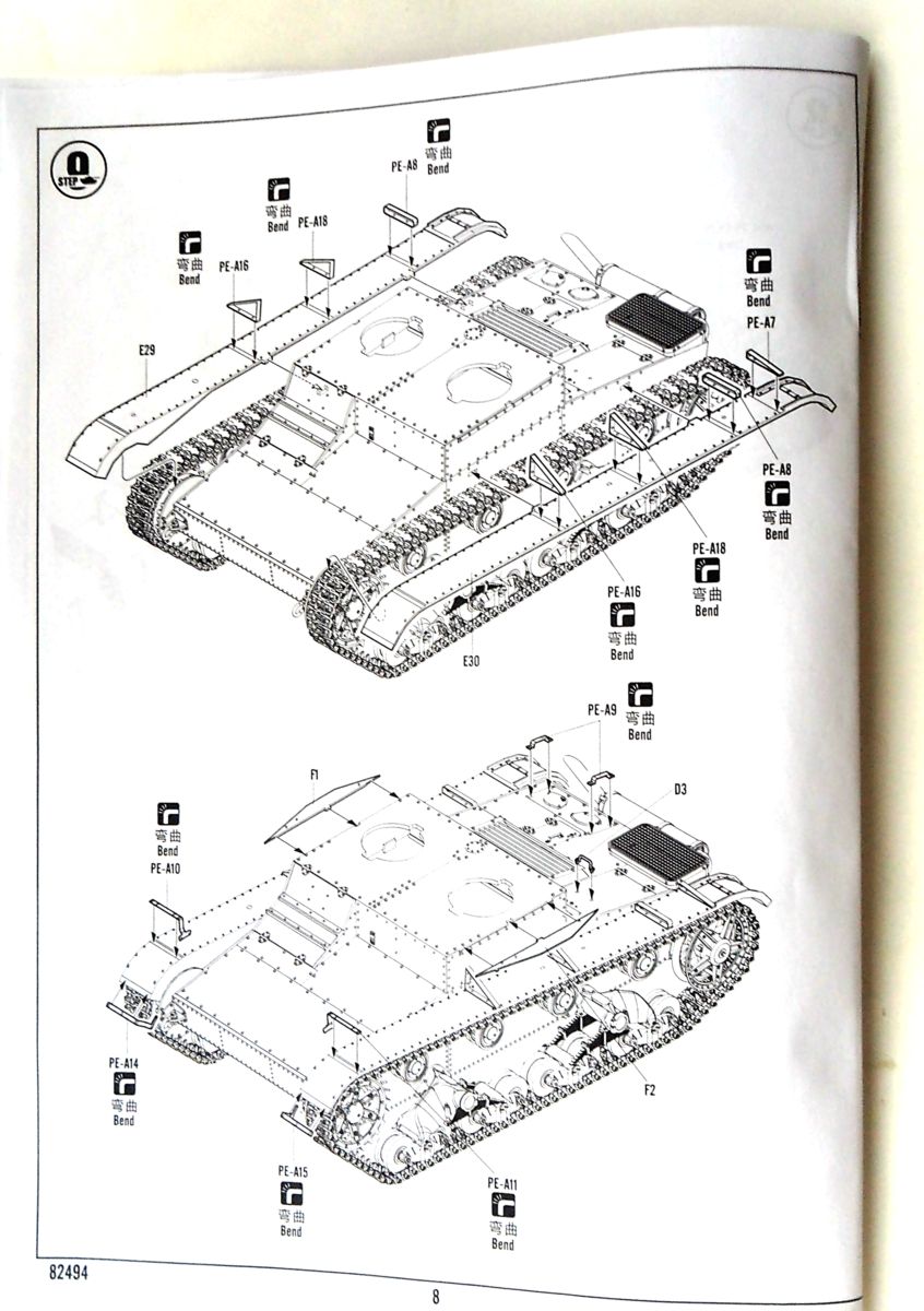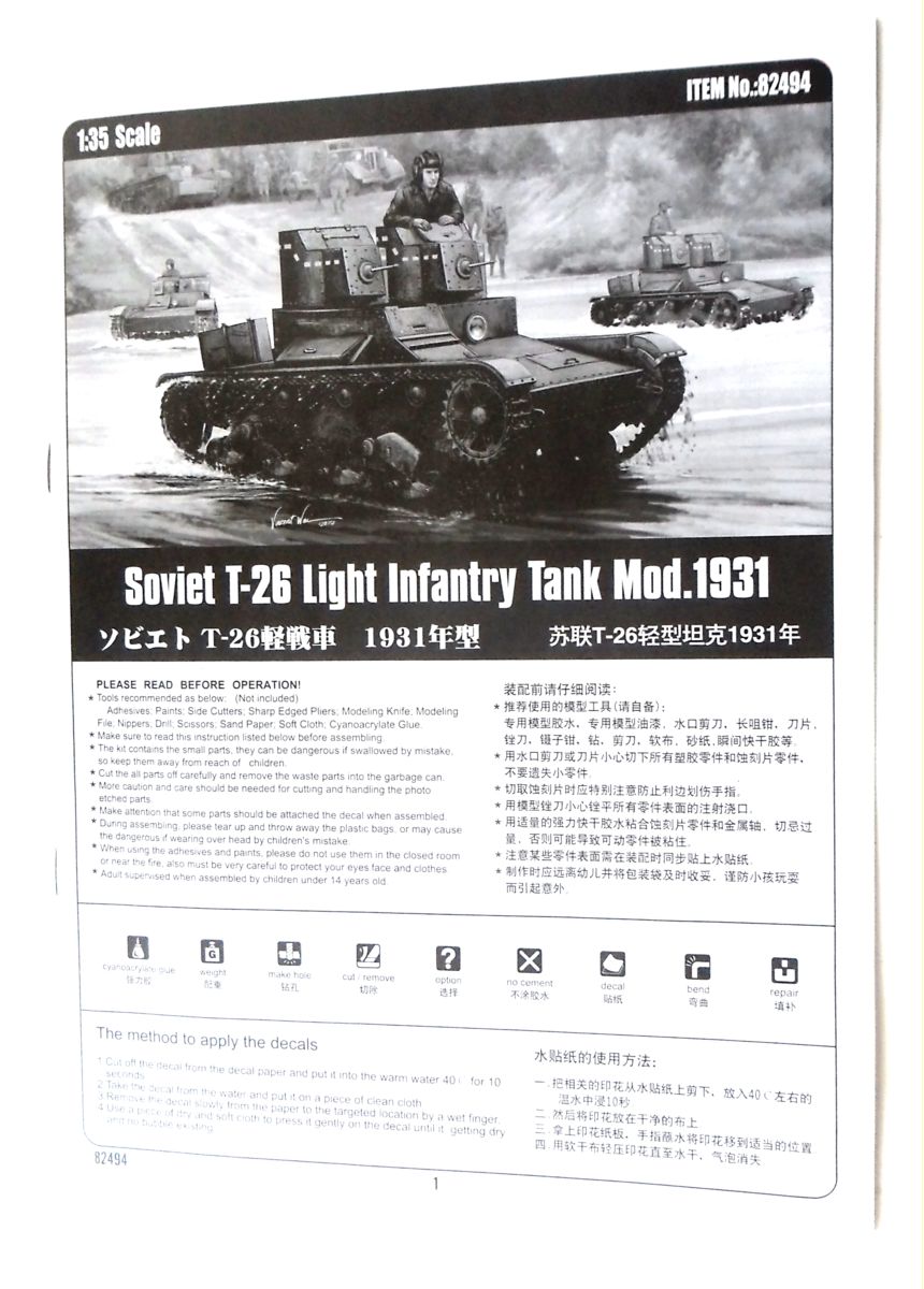 Модель упакована в плотную коробку, красочно оформленную в стиле данной компании. Внутри коробки находятся: ванна корпуса, 14 литников самого танка, один прозрачный литник со светоотражателем фары, 24 литника с траковыми пальцами и пакетик с рассыпными траками, инструкция в виде книжицы на 6 листах формата А4 в черно-белом изображении, цветной боковичок с образцами окраски машин, цветной лист с вариантами размещения травления, две небольшие платки травления и декаль с опознавательными знаками РККА на 30-е годы.