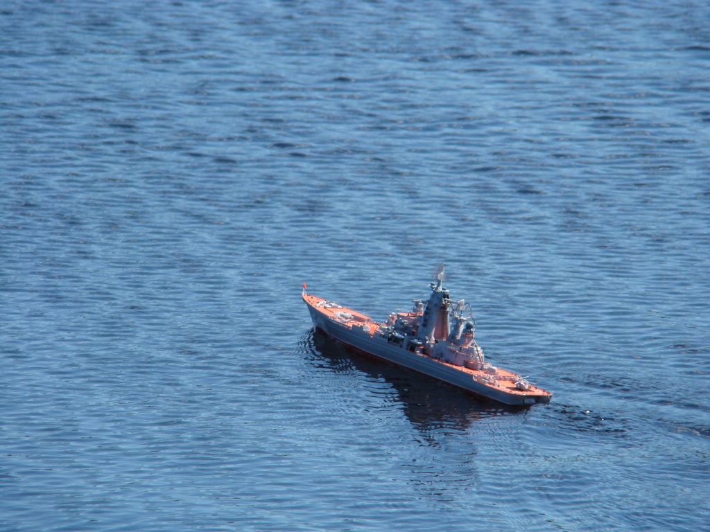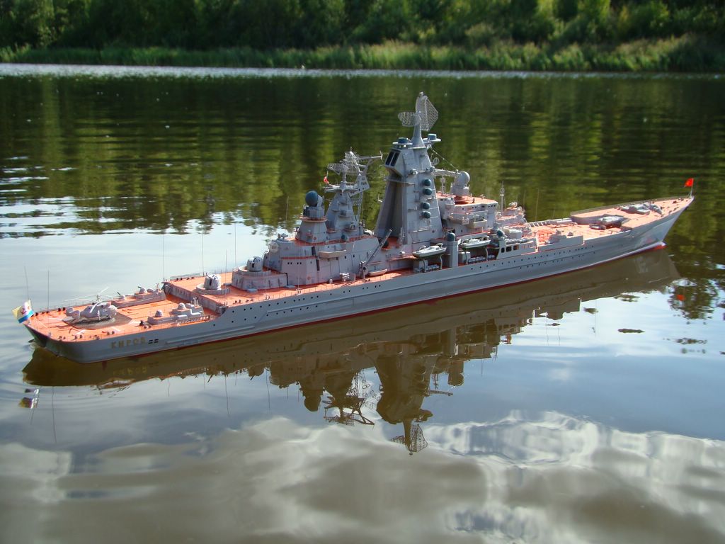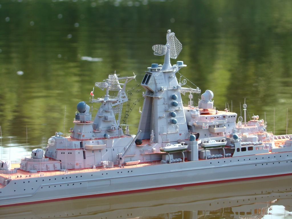 ТАРК «Киров», масштаб 1:350. Модель строилась с доработками, процесс постройки занял три года. Модель ходовая. Многие технологии отрабатывал впервые: впервые работал с травленкой( да, забыл сказать травло WEMовское), на этой модели учился красить аэрографом, учился паять поручни в таком масштабе, многое делал впервые. Одним словом модель позволила отработать и выучить много полезных технологий. Ватервейс изготавливал из аракала. Скобтрапы изготовлены из проволоки, «усы» из неё же. Такелаж делал из нити для бантиков. Носовая РБУ изготовлена с нуля из латунных трубочек нужной толщины. На вертолете воспроизведен автомат перекоса, а внутри салона располагаются кресла, рычаги управления(спасибо WEMу), к сожалению этого не видно.