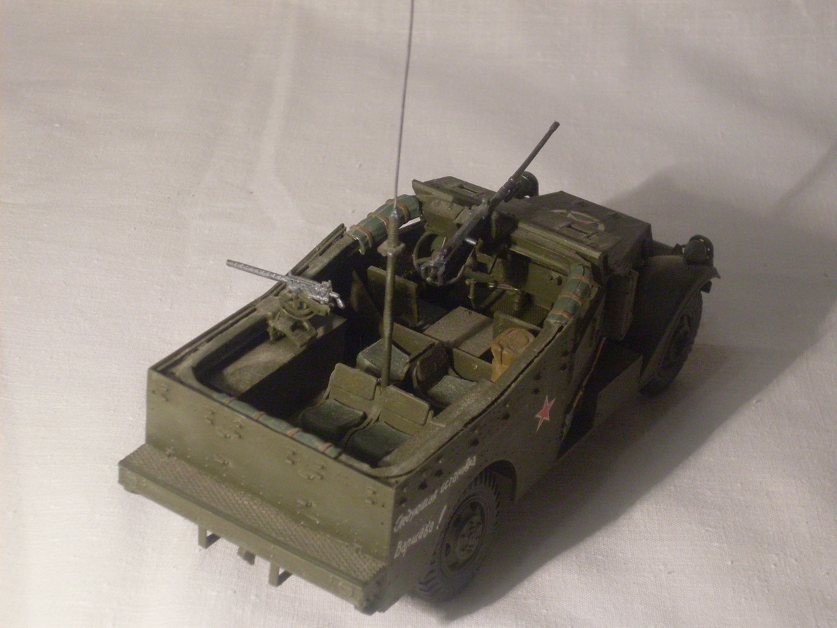 Эх, сам начинал с такой)))) Здесь доделать просто непроходимо - штатные фары, решетки - в помойку (отлично и быстро можно сделать прутья из литника)Задние огни необходимо залить лаком. Если нет радиостанции - то антенна не нужна.Брезент слишком зелен - ошиблись с цветом. Руль, приборы тоже нужно окрашивать.Удачи.