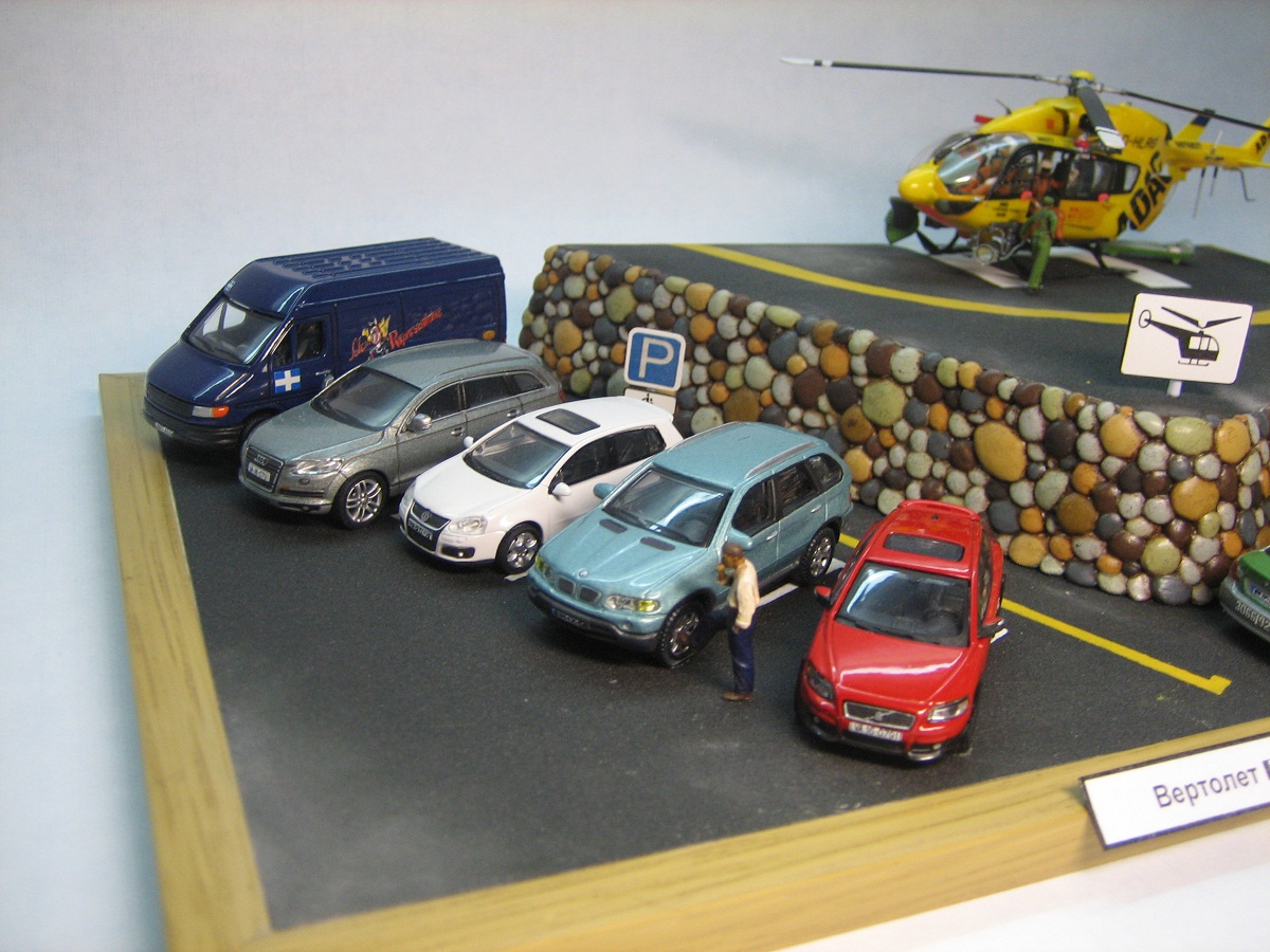 Привет всем :) Вот решил отступить от военной тематики и собрать что-нибудь гражданское. Понравился один вертолётик ( яркий , желтенький :) ) ЕС-145 ADAC oт Heller. Модель очень понравилась 5+ ( стыкуемость, деталировка, даётся интерьер и 3 пилота ). Собрал - класс !!! Но маленький такой, и одинокий :( , вот решил ему составить компашку ( но так как легковых, современных машин в 72 м. не нашел , подобрал из коллекционных, металлических ). Изобразил кусочек европы. Потом еще добавил знаки и людей. Родился маленький сюжет про ЧП с бочкой масла и германским полицейским, который выписывает трындулей нерадивым грузчикам ( БМВ полицая рисовал сам ) :))) Вот както-так. Не судите строго, диорама делалась с юмором :) Всем приятного просмотра.