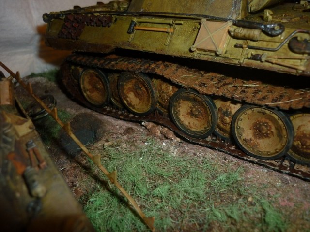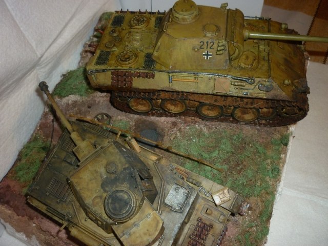 Представляю Вашему вниманию свой долгострой. На полке стоял собранный звездовский Т4, у которого от натяжения гусеницы оторвало ленивец. Было принято решение подбить его по ходовой окончательно. А тут еще и Пантера подсобралась и покрасилась. Подставку сделал из пенопласта и сверху залил гипсовой штукатуркой, пока гипс подсыхал, вдавил танки. Земля - спитой кофе+пва. Грязь на Пантере тот же состав и настриг кисточку для имитации травы забившейся в траки. Трава- сантехлён. Пробоины делал зубным буром, грани траков натёр графитом(щётки от эл.двигателя- удобно). Окраска- акрил Звезда и Тамия, смывка худмасло на вайте от Тикурилы, Пылил тёртой пастелью. Нагар имитировал отработкой из тонера от лазерного принтера. Им же и горелые бандажи на четвёрке. Кометируйте, отценивайте, кидайте табуретками - ко всему готов ибо в каске и окопчике)))