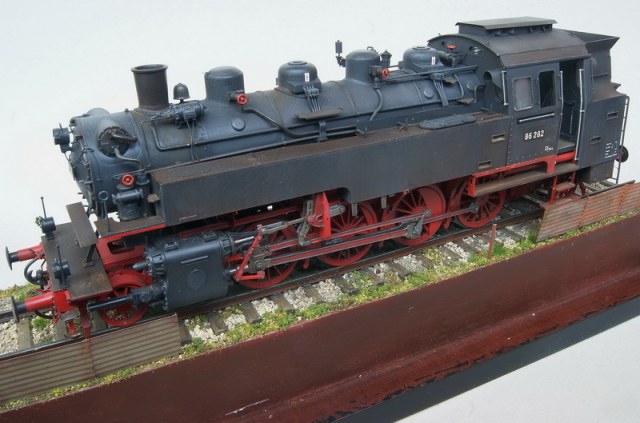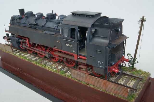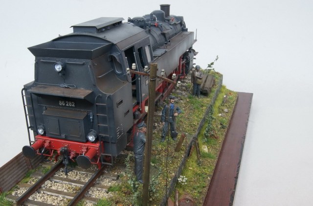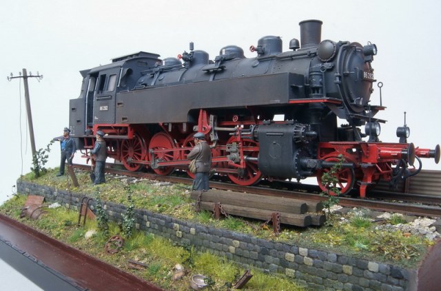Набор от Trumpeter представляющий паровоз-танк BR86, разбавленный наборами от ET Models: смоляные колеса, базовый набор фото травления, интерьер от Eduard и LZ Models. Описывать процесс сборки всего этого в конечный результат слишком долго и я уже не помню многих нюансов. Поэтому скажу лишь что представленный на фото сюжет не имеет ни каких привязок к действительности. Просто мне захотелось сделать это именно так.