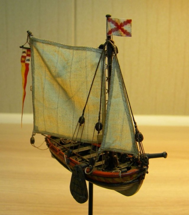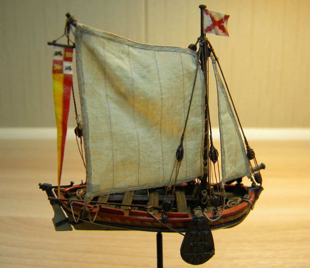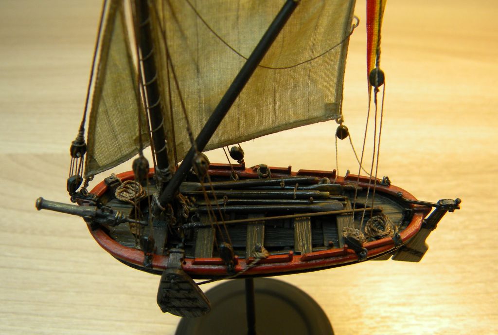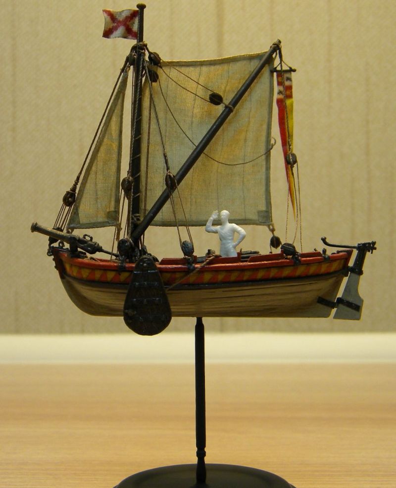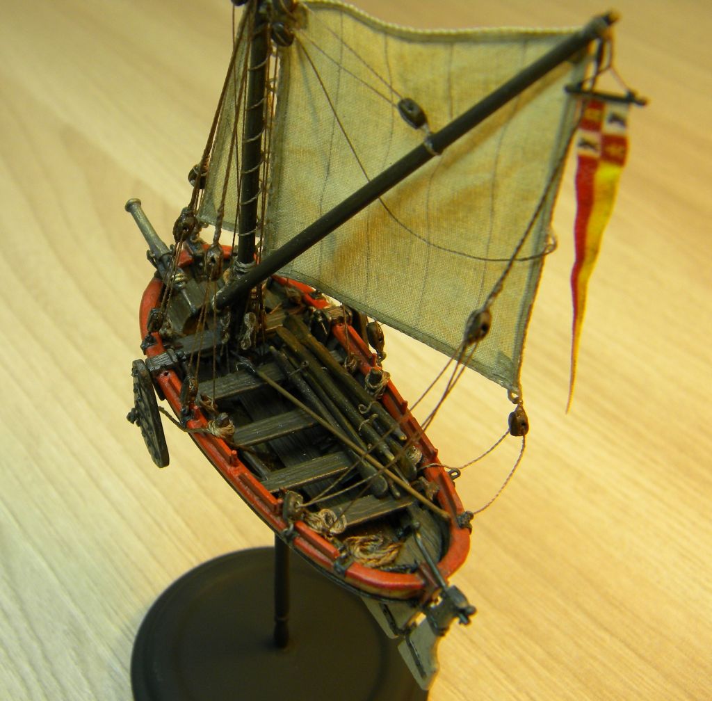 С такелажем несколько перемудрил в сторону усложнения(это если ориентироваться на описание ботов со шпринтовым вооружением у К.Х.Марквардта),хотелось повозиться с блоками...не уверен насчет шпринтового вооружения у шлюпки с испанского галеона,может надо было латинский парус ставить,но захотелось со стакселем...тут уже сказка- отбили бот у англичан ,и используют без зазрения совести!