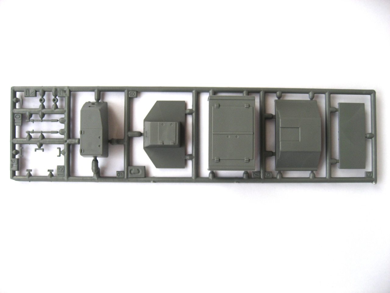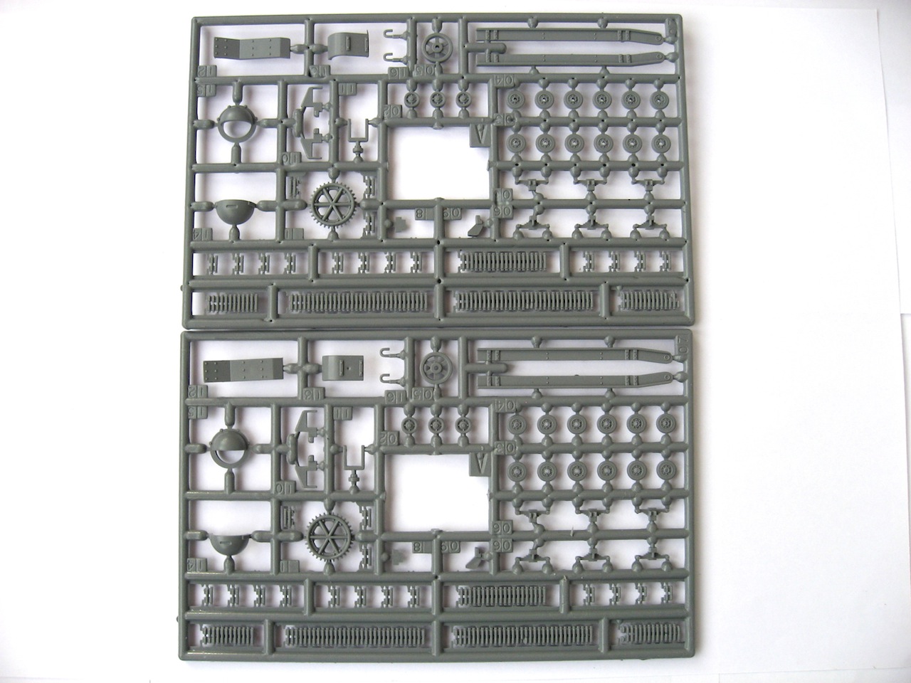 Набор не богатый. Четыре не больших литника с деталями среднего качества. Облой и толкатели присутствуют. Зато два варианта сборки. Во как. Но собирается, на удивление хорошо и на раз. Стыковка нормальная. Но без шпаклевки не обойтись. Ну-с, имеются наборные траки. Но качество не выдерживает ни какой критики. Интересно, кто нибудь делает траки на эту машину? Я поверхносно посмотрел, не нашел. Может кто знает?