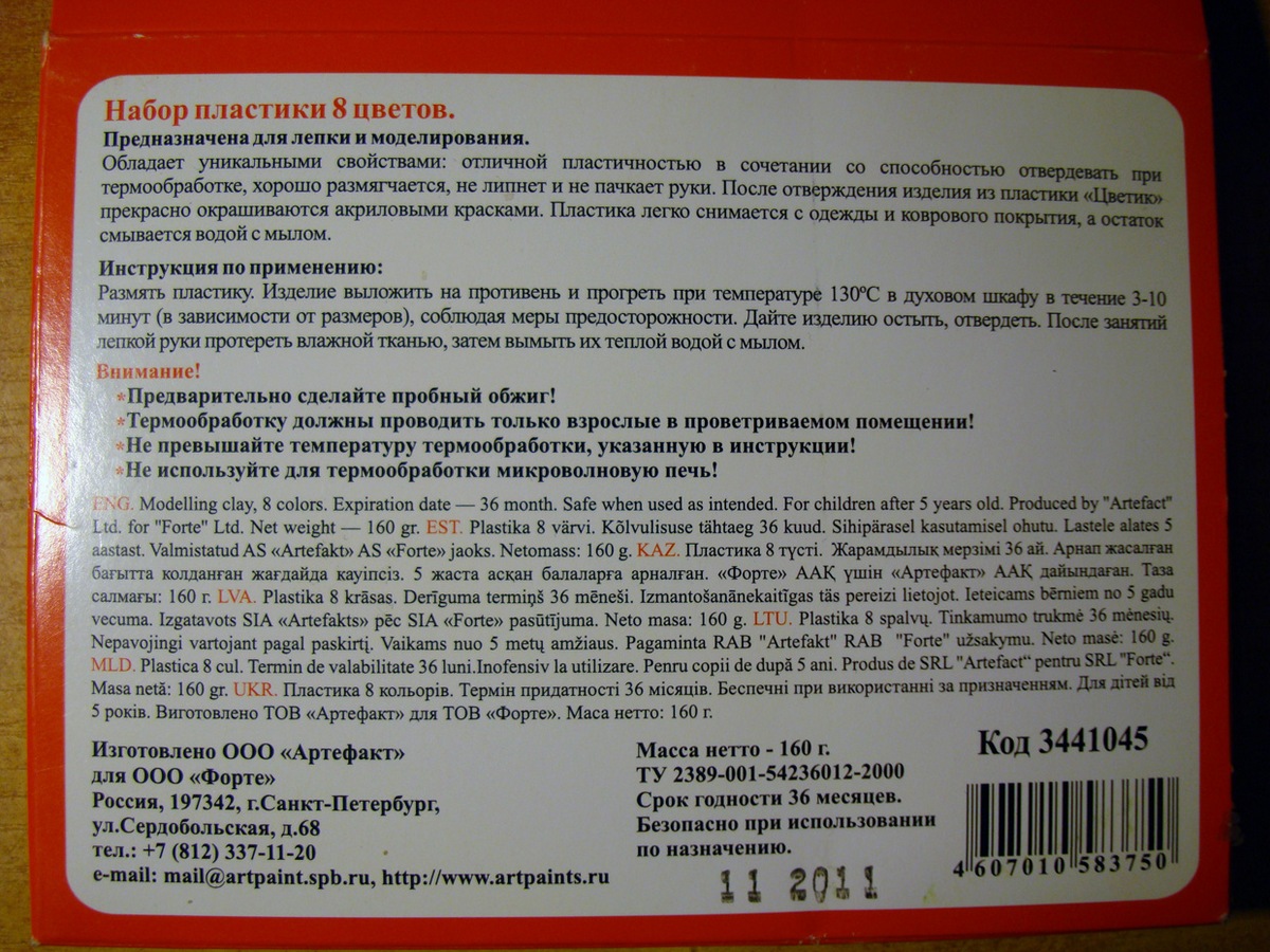 Размять пластику. Изделие выложить на противень и прогреть при температуре 130 градусов в духовом шкафу в течение 3-10 минут (в зависимости от размеров), соблюдая меры предосторожности (нельзя превышать температуру обжига выше 130 градусов). Дайте изделию остыть, отвердеть. После занятий лепкой руки протереть влажной салфеткой, затем вымыть водой с мылом.
