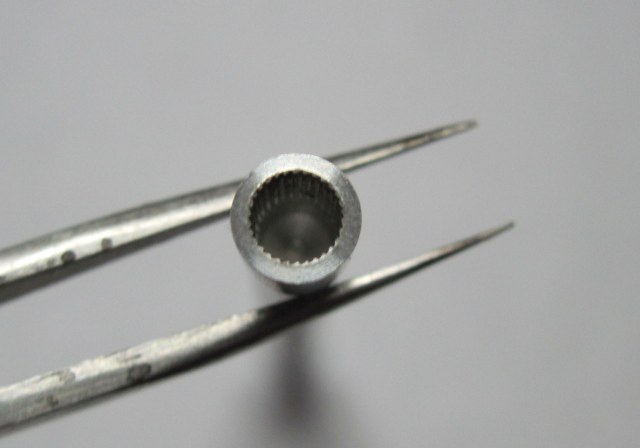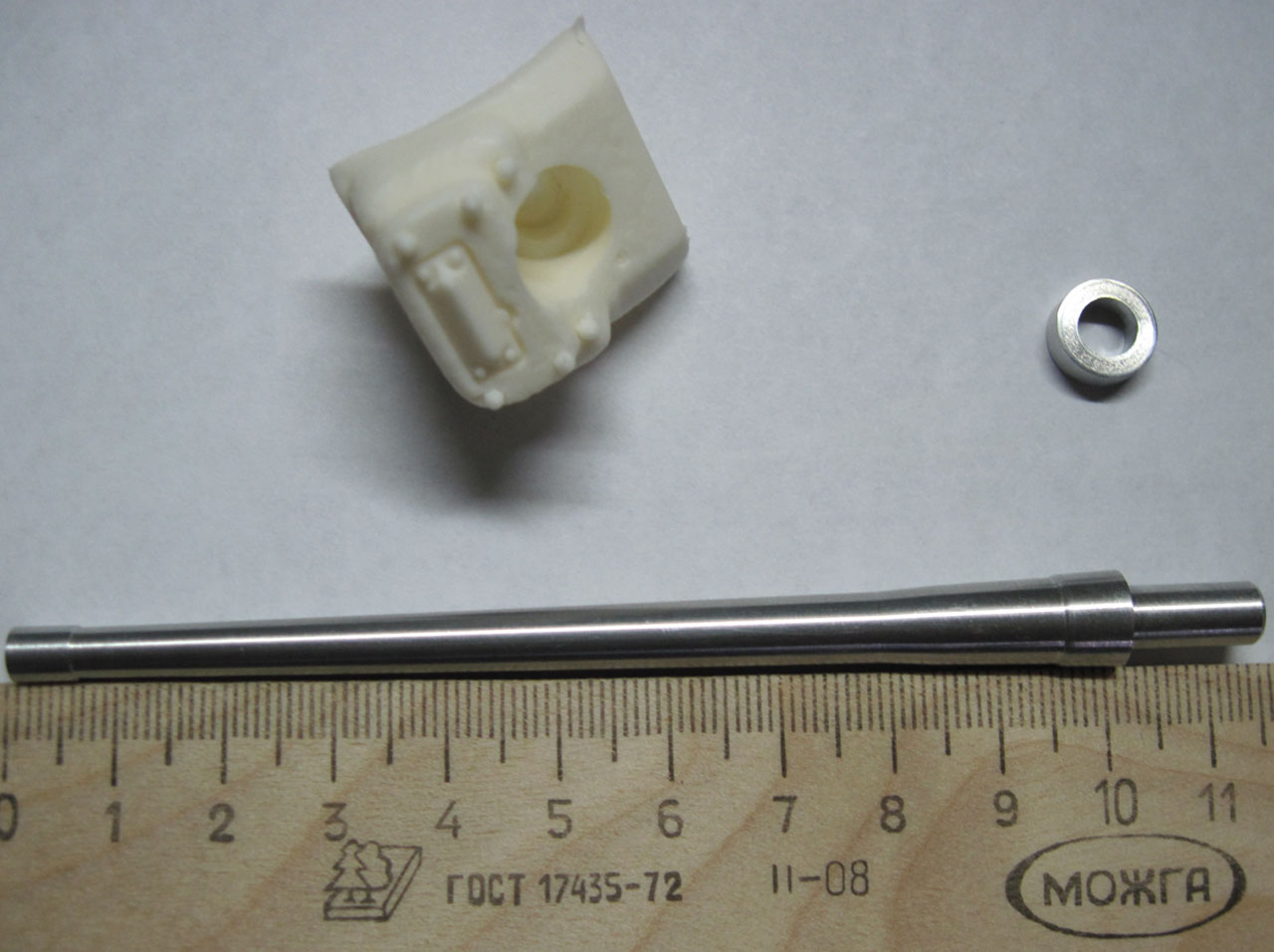 В полиэтиленовом пакетике находятся собственно точеный ствол, металлическое кольцо, в которое оный ствол следует продевать и отлитая из смолы бронемаска (которая дополнительно упакована в пакетик поменьше, чтобы не контактировать с металлическими деталями, надо понимать). Ствол высверлен на 10 мм., имеются подобия нарезов (соответствие количества нарезов прототипу не проверял). На бронемаске присутствуют имитации литься и газовой резки. Из недостатков следует отметить отсутствие на бронемаске рым. Соответственно придется использовать идущие в комплекте с моделью и клеить их "на глазок" (намек на посадочные места тоже отсутствует). Кроме того производитель поленился просверлить в бронемаске отверстие под ствол до конца. Собирать все это придется с помощью циакринового клея.