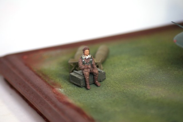 Самолет сделан неплохо,сама задумка композиции интересна,но вот постановка...? Почему 2 лётчика,где технота? Почему двигатель работает,упорных колодок нет и кабина пустая и закрытая? Что-то чувствуется небольшая недоработка.