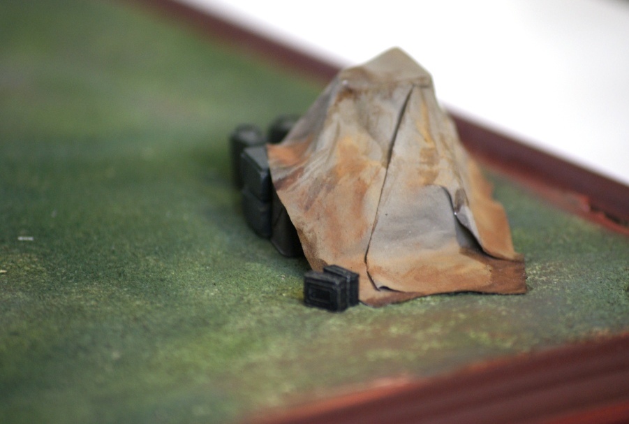Самостоятельно изготовил: подставку, основание, антенну, полог. Подставка - изготовлена из рамки для фото, основание - из гипса посыпанное опилками с ПВА, антенна - нить для бисера, полог - бумага от декалей