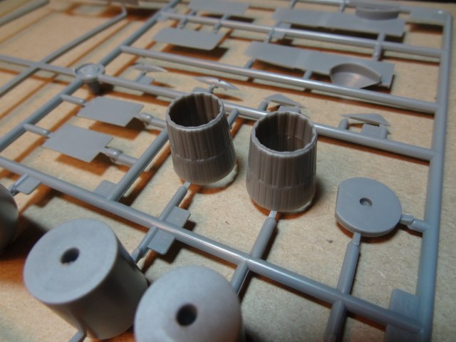 2. Шасси. Передняя стойка. Дана в двух вариантах. Видимо потому что у Трумпетера этот литник одинаковый с моделью СУ-27 УБ. На литнике со стабилизаторами, носовым конусом и прочим у нас идёт стойка с одним колесом как на СУ-27 УБ. И есть маленький литничек с отлитой двухколёсной носовой стойкой, для которой колёса отлиты вместе с грязевыми щитками. Это уже для СУ-30 МКК. Вся беда в том, что и там и там эта стойка дана одной деталью из-за чего она смотрится слабовато детализированной и слегка замыленной. А колёса, понятное дело, надо стачивать, ставить туда резиновые от Экипажа, а щитки пробовать доработать.