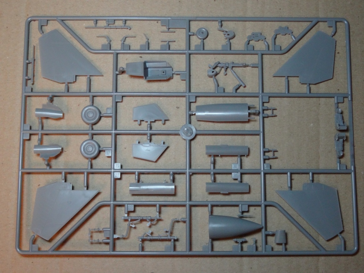 Модель в 72-ом масштабе. Упакована в красочную плотную коробку. Внутри, литники, упакованные в полиэтилен. Фюзеляж дан двумя половинками вместе с крыльями. Облоя практически нет. Расшивка очень богатая, тонкая и аккуратная. Присутствует также очень аккуратная клёпка. Штанга дозаправки в воздухе дана отдельной деталью, которую можно поставить выдвинутой, а можно и в убранном положении. Кабина - обычная ванна, на которую, правда, предлагается неплохая, на мой взгляд, декаль. По фонарю идёт, как и во многих моделях, отвратительнейший шов. Как на откидной части, так и на козырьке. Вооружение - богатый комплект ракет с довольно тонкими стабилизаторами. Мне кажется, их можно даже не обтачивать. Но, это, конечно, моё субъективное мнение. Инструкция - бумажный альбом с качественными понятными рисунками. Декаль на два китайских варианта с довольно богатой техничкой. В чертежи модель не вкладывал.
