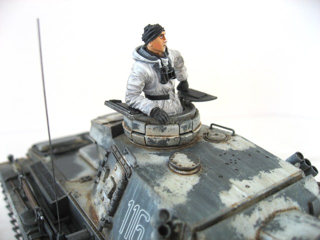 Про камо разговор особый. Я когда начинал работу, даже не знал как буду делать. Все получилось экспромтом. Залил базу жидкостью для сколов АК и сделал быстро камо. А потом жесткой, мокрой кистью прошелся по базовому цвету, заезжая конечно на белый камо. Вот и получилось, что вытер с базы лишнюю краску, что от камуфляжа налетела и заодно получились четкие границы камо. Сам не ожидал что так получится. А остальное все как обычно. И масло и эмаль и сухая кисть. Вообщем намешал я тут порядочно.
